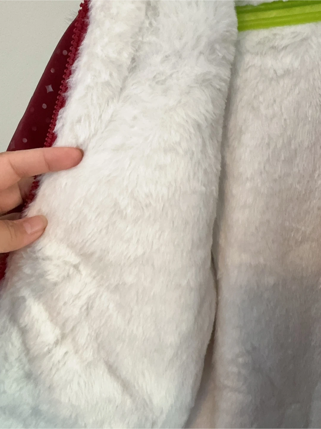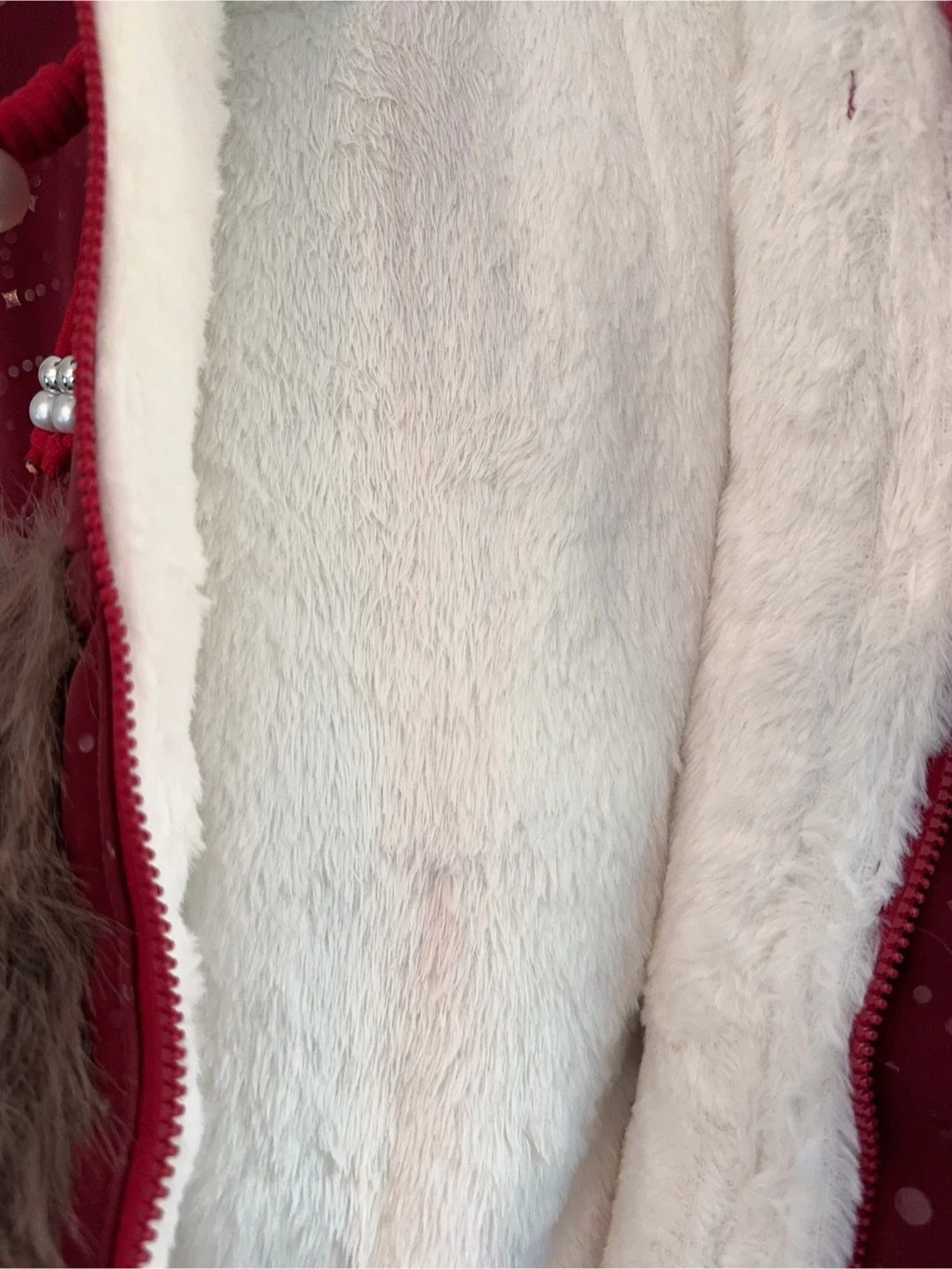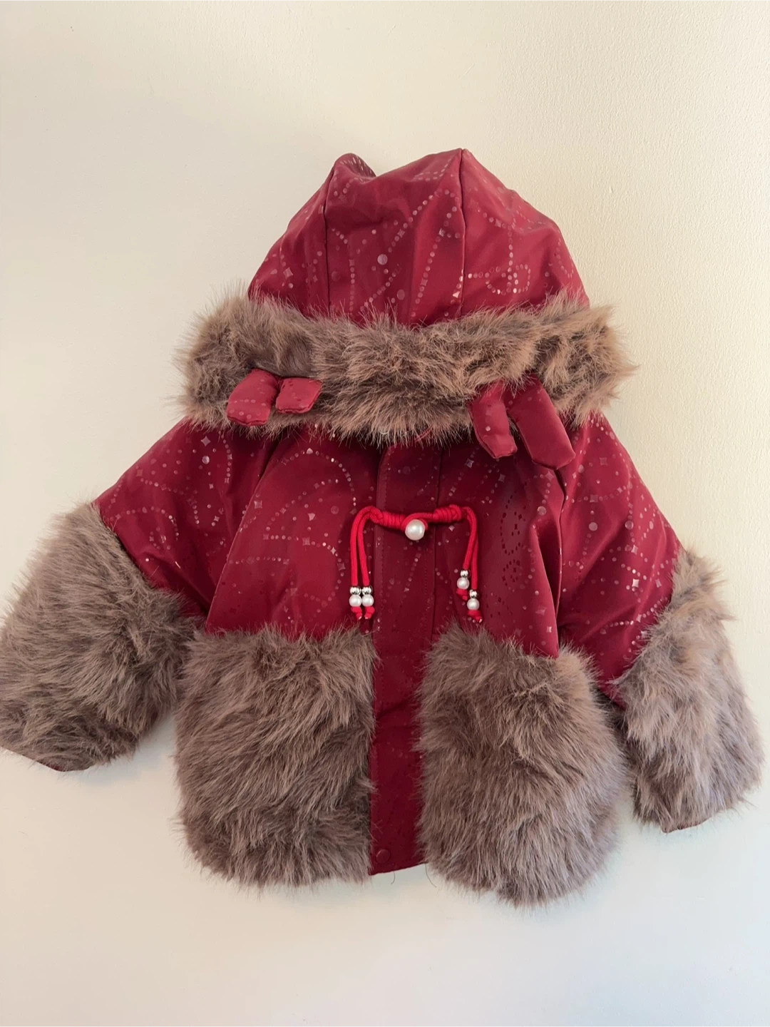A cute and cozy red winter coat for your little one! It features a fur trim around the hood and sleeves, with a soft, plush lining to keep them warm during the cold months. Toddler size 6-7T, little red dye inside the coat, not very visible.