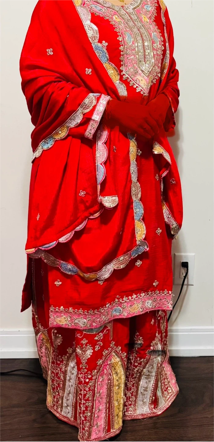 Beautiful red indian/pakistani suit with intricate embroidery. Perfect for special occasions!