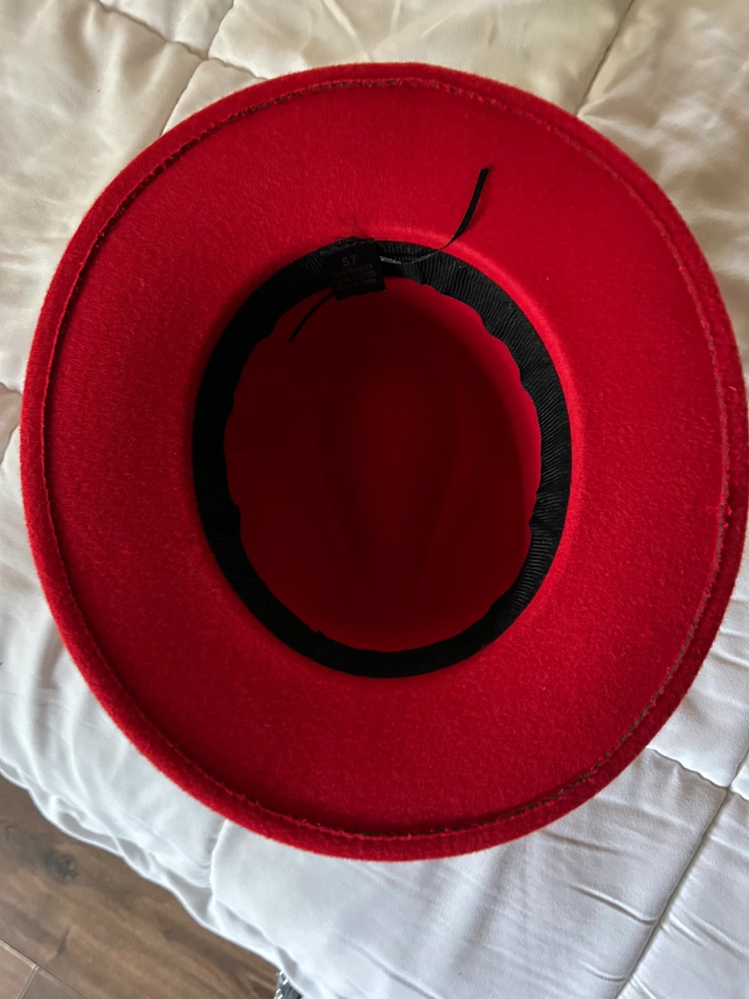 Selling a stylish red fedora hat! It's in great condition and features a chic gold chain detail. The size is 57, and it's made of 100% polyester.. ps I have lots of other colors, blue green, black brown pink purple all for $25 cash location Capitol Hill Northwest
