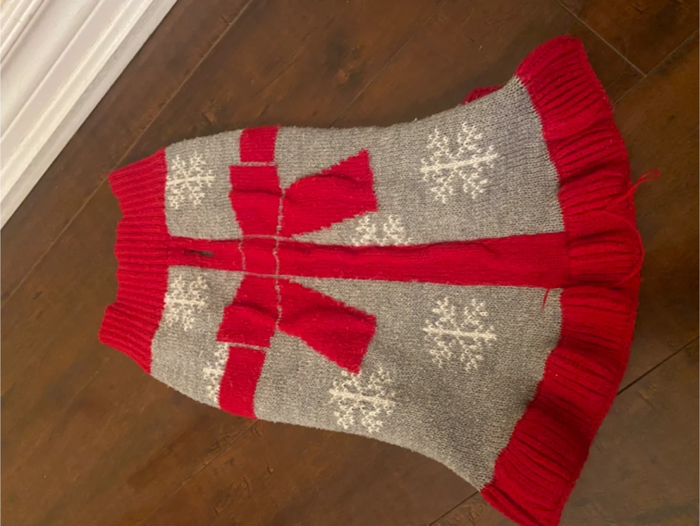 Cozy little sweater for your furry friend! It's grey with a red trim and a cute snowflake design. Perfect for keeping your pup warm during those chilly Canadian walks