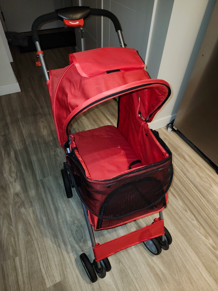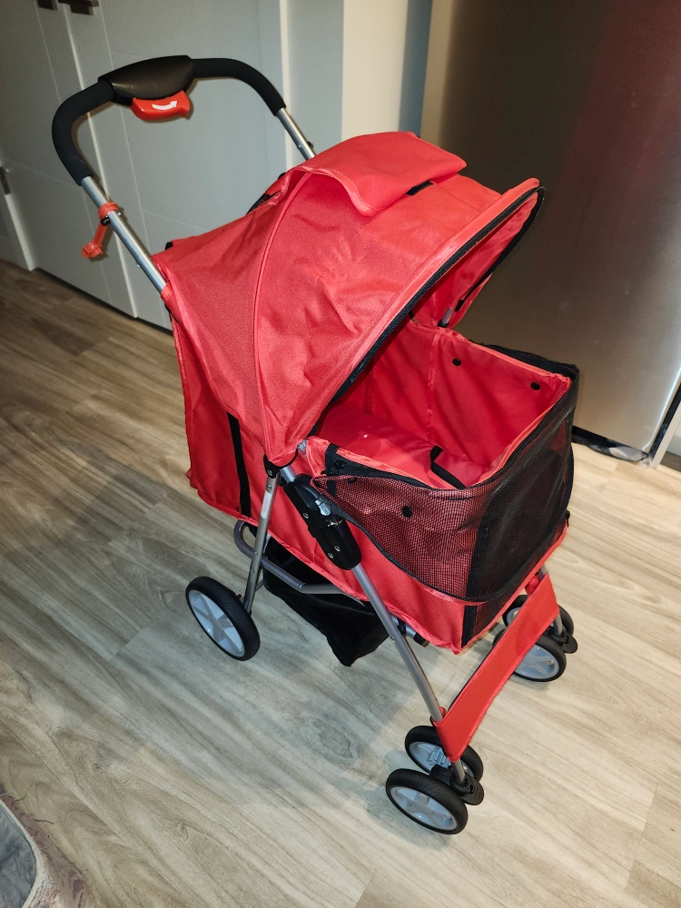 Selling a red pet stroller, perfect for taking your furry friend on walks or a trip to those dreadful vets lol. This stroller will make your adventures with your fury friends enjoyable and fun. It also comes with a detachable cup holder