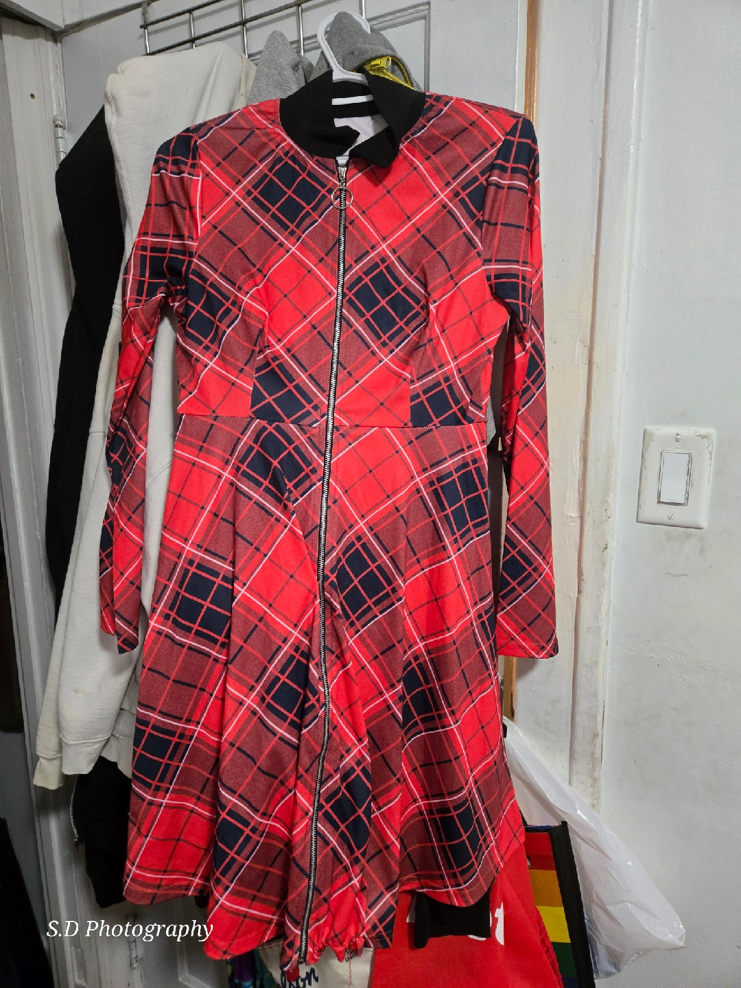 Brand new never worn, Red plaid dress with a full zip-up front! The dress features a black collar and long sleeves. Great for adding a bit of edge to your look.