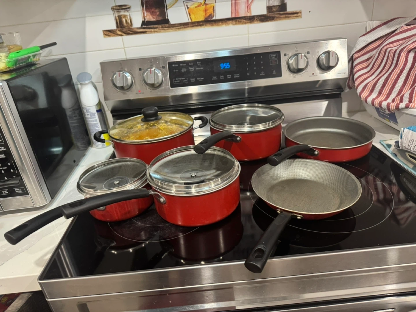 Selling a complete set of used red pots and pans. This set includes various sizes of pots with lids and frying pans and cooking spoons , perfect for cooking up a storm in the kitchen! They've been used but are still in good condition for your cooking needs