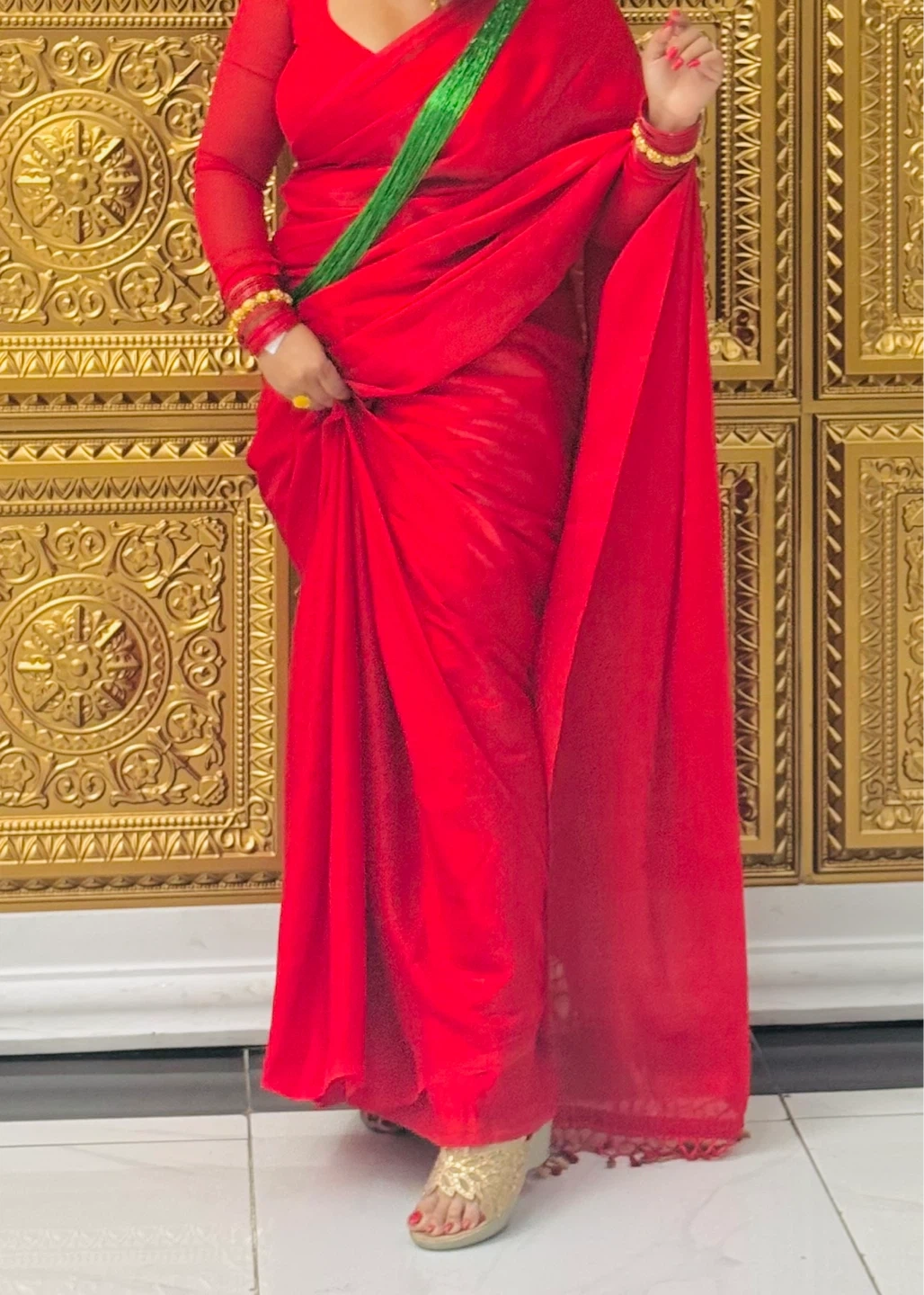 Beautiful red saree with a vibrant green accent piece! The fabric drapes elegantly and would be perfect for a special occasion or cultural event. It looks like it's in great condition and ready for a new home