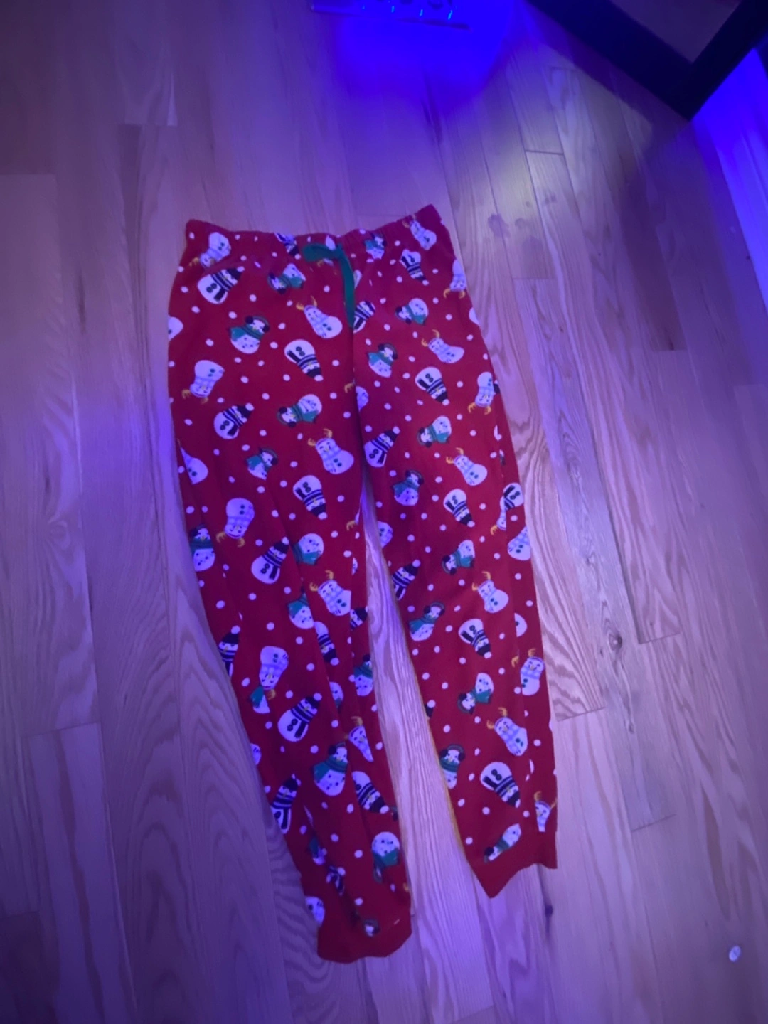 Cozy red pajama pants with a fun snowman pattern! Perfect for lounging around the house during the holidays. They have a comfortable fit and a drawstring waist.