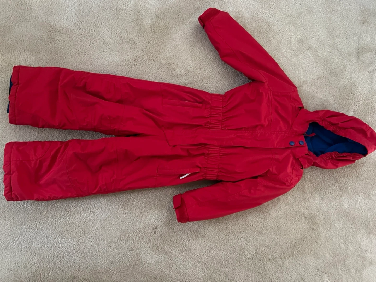 Here's a red snowsuit, perfect for keeping your little one warm and dry during the winter months! It looks to be in great condition and ready for some snowy adventures. Used one season.