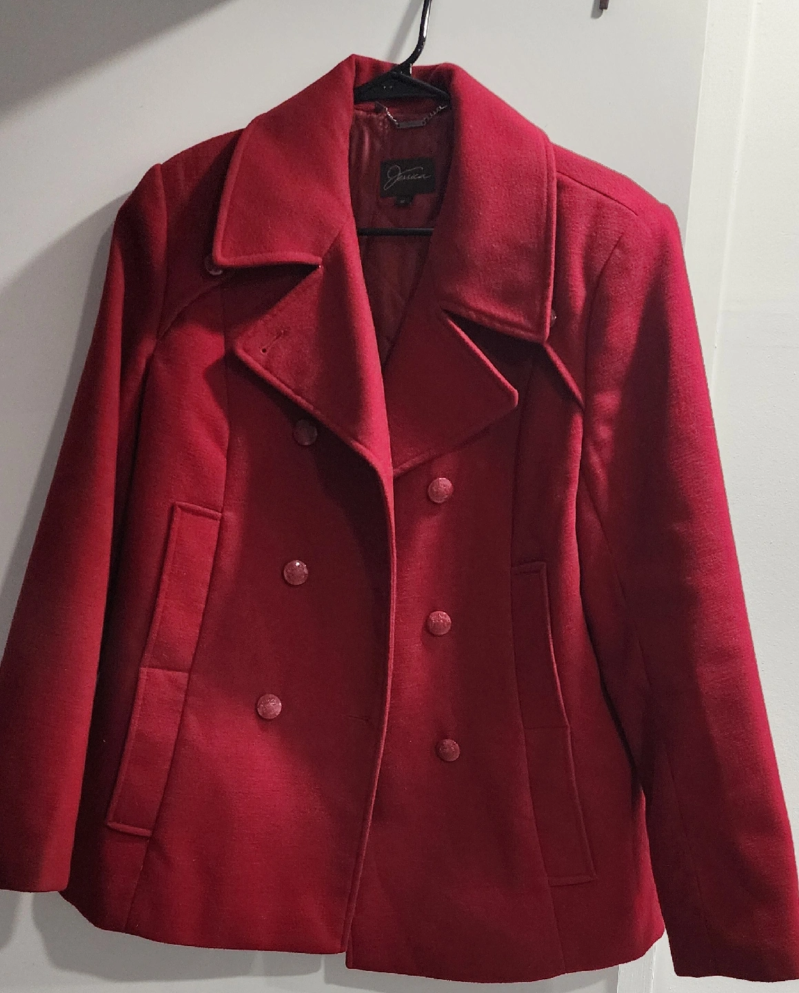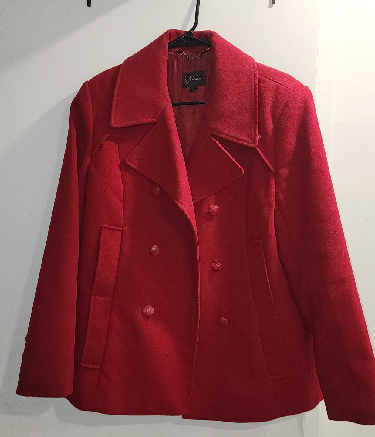 Here's a stylish red peacoat from Jessica's! It's made from a wool blend, perfect for keeping warm on chilly days. This coat is in great condition and ready for a new home. Size 12