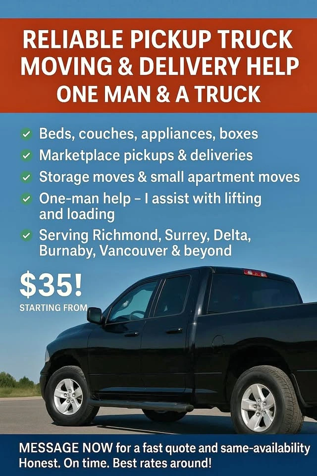 Need help moving something big or small? I offer affordable, friendly moving service across the Lower Mainland with my pickup truck. Beds, couches, appliances, boxes Marketplace pickups & deliveries Storage moves & small apartment moves One-man help - I assist with lifting and loading Serving Richmond, Surrey, Delta, Burnaby, Vancouver & beyond