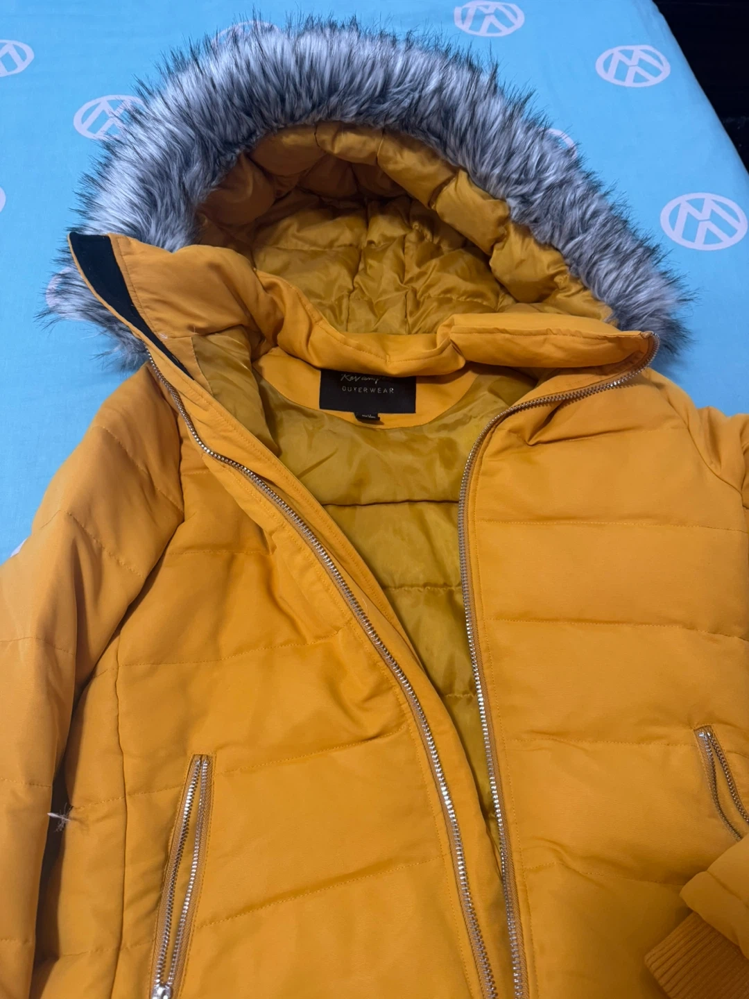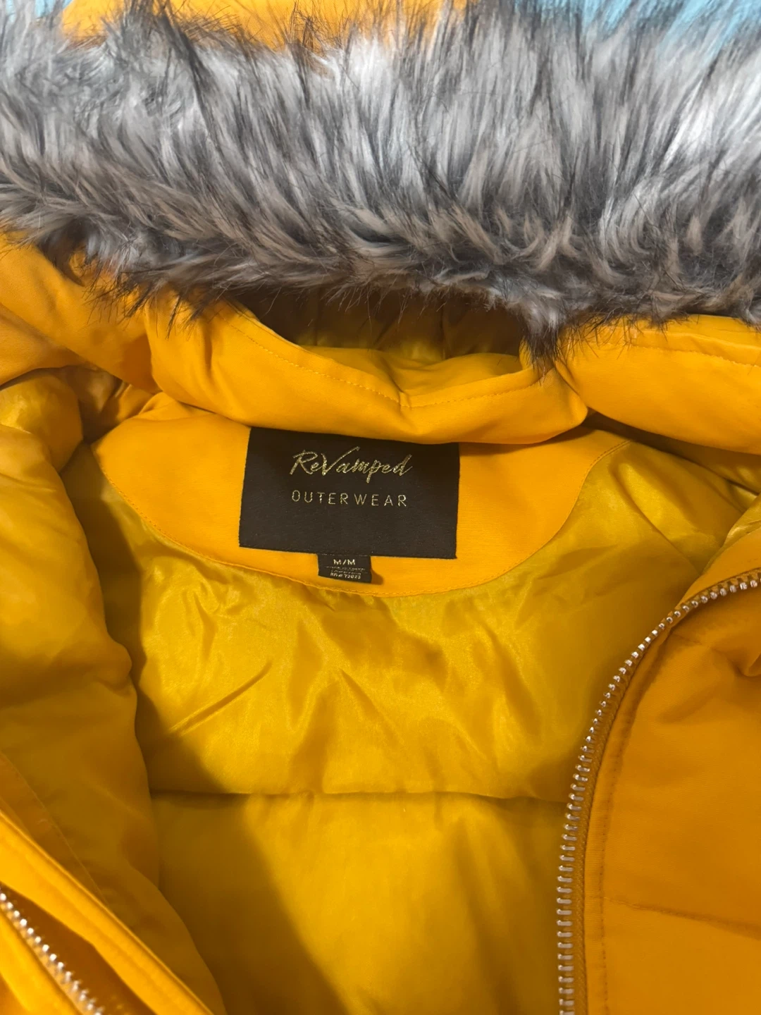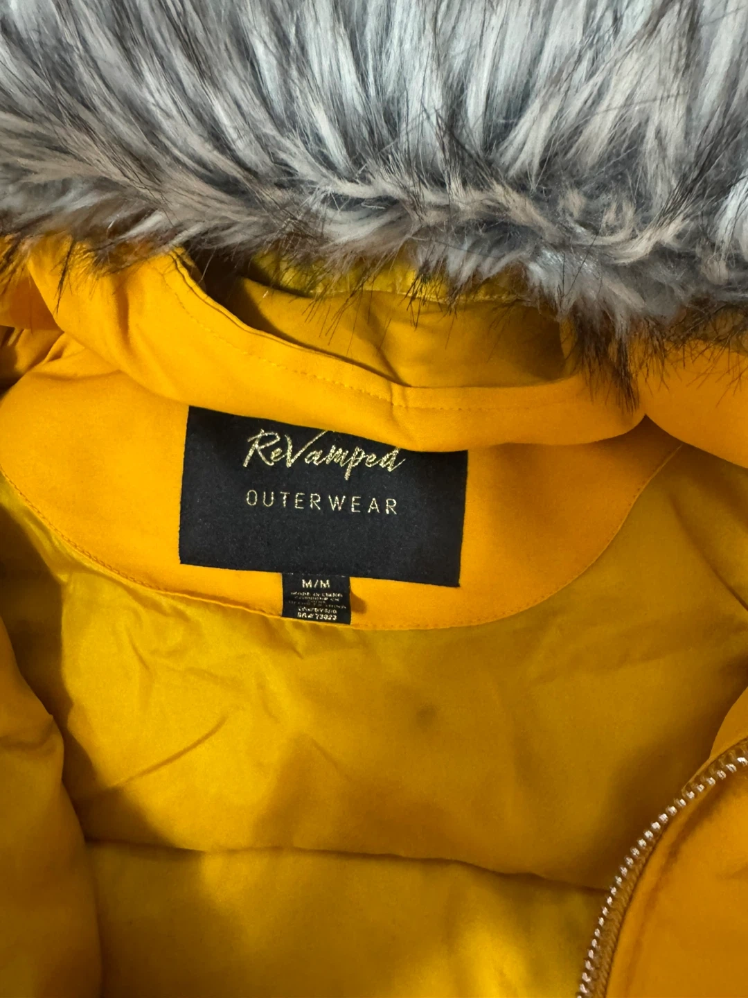Selling a ReVamped Outerwear puffer jacket in a vibrant yellow colour! It's a size M/M and features a faux fur hood. Perfect for staying warm and stylish during the colder months!