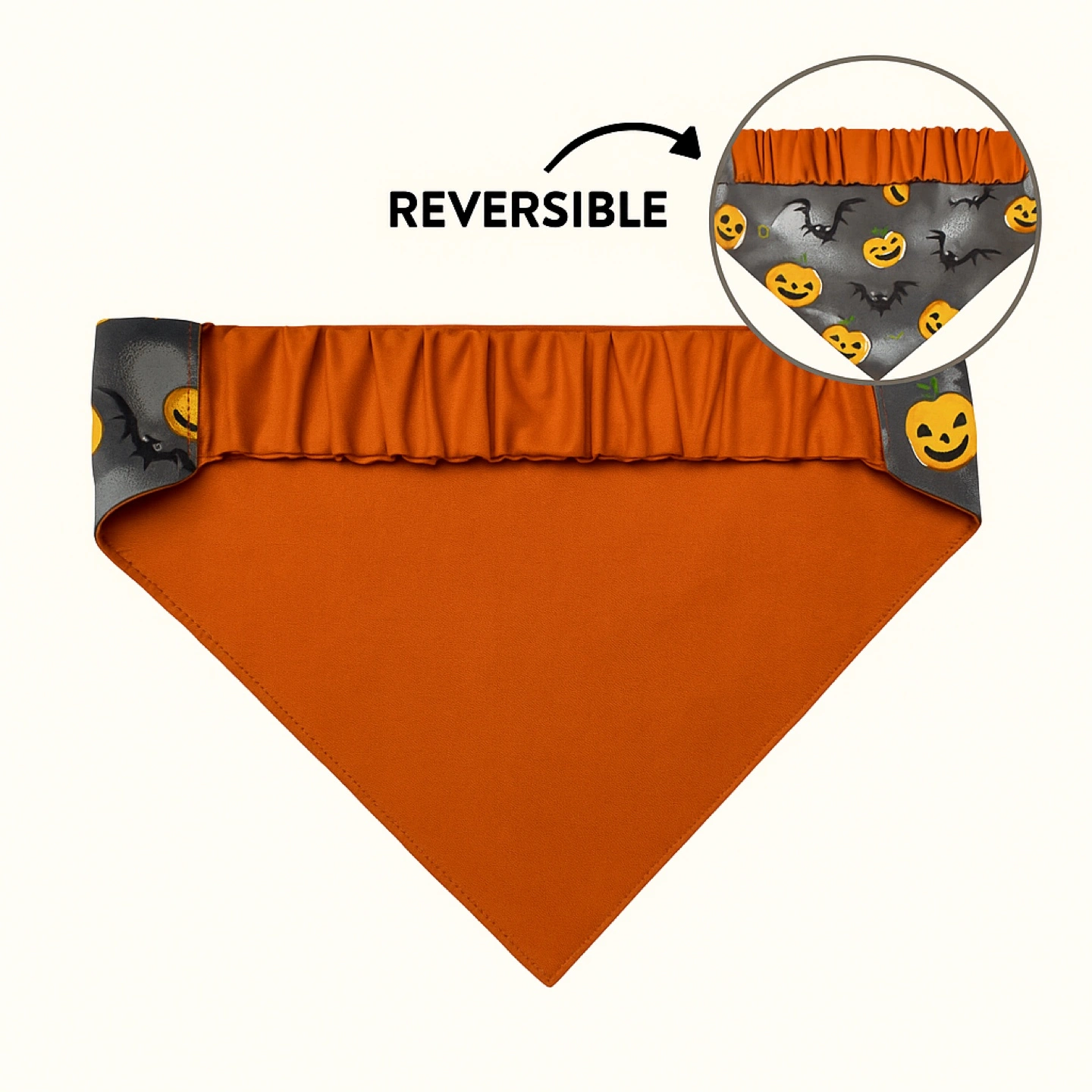 Check out this reversible dog bandana! One side is a solid burnt orange colour, and the other has a cute Halloween pumpkin and bat pattern on a grey background. It's brand new, never been used, and ready for your furry friend to show off their spooky style 100% cotton Price vary depending on size Starts at $8