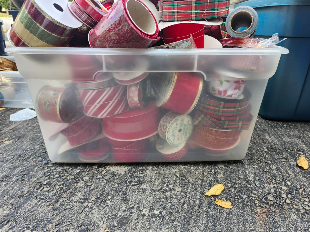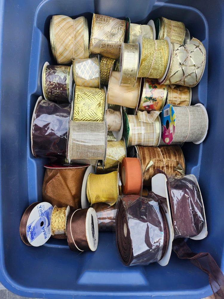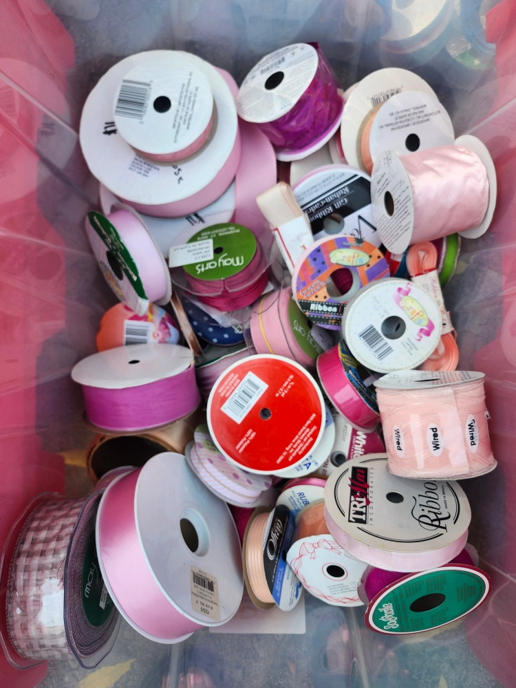 Selling a large lot of ribbon in various colours and styles! Perfect for crafts, gift wrapping, or any decorative project you might have. There's a wide variety of colours and patterns to choose from, fill a reusable bag for $20, bins sorted by color! Many are new, some are partially used.