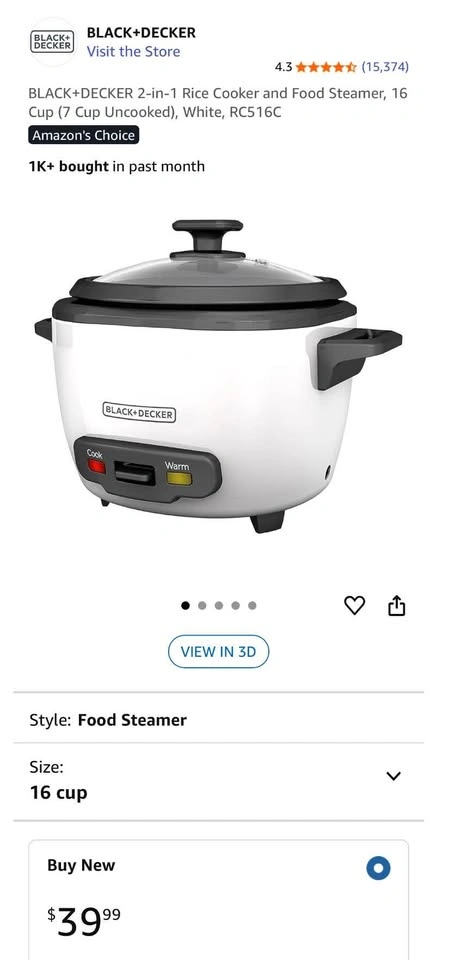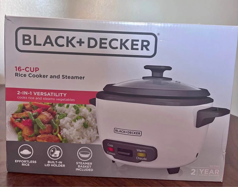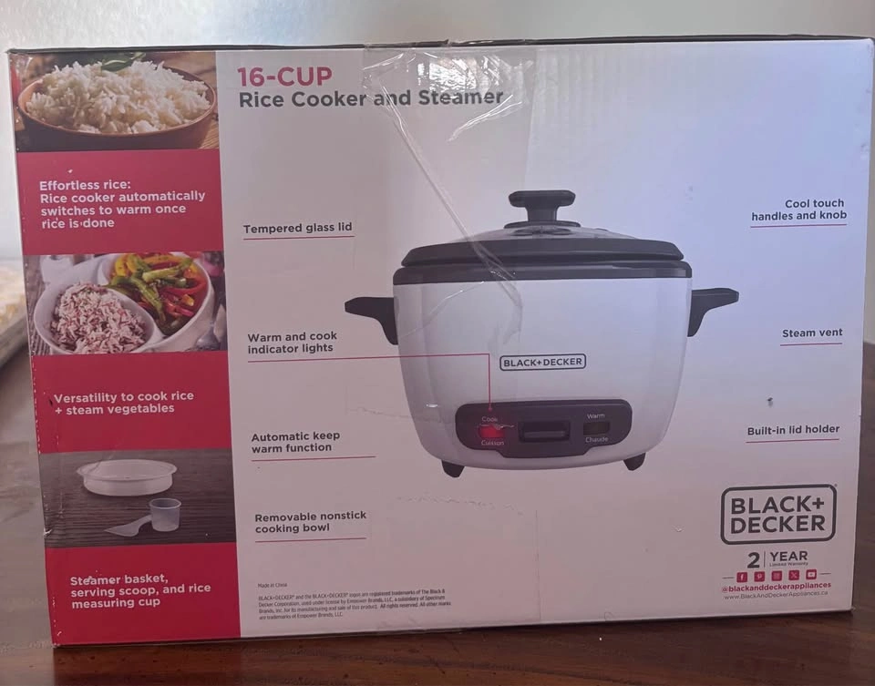 BLACK+DECKER 2-in-1 Rice Cooker and Food Steamer – 16 Cup – White In excellent condition – used only a couple of times. Features: * Large 16-Cup Capacity – Perfect for family meals or meal prep. * 2-in-1 Functionality – Cooks rice and steams vegetables, fish, and more. * Steaming Basket & Removable Non-Stick Bowl – Easy to clean and versatile. * Automatic Keep Warm Function – Switches to warming mode once cooking is complete. * Two Heat Settings – Ensures perfectly cooked rice every time. * Includes Measuring Cup & Serving Spoon – Everything you need to get started. Ready to use and works like new.