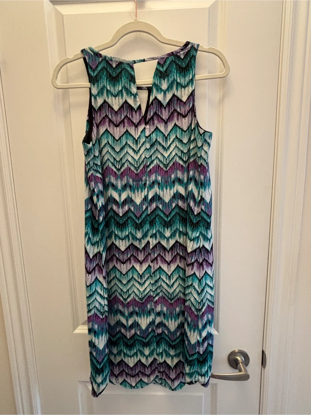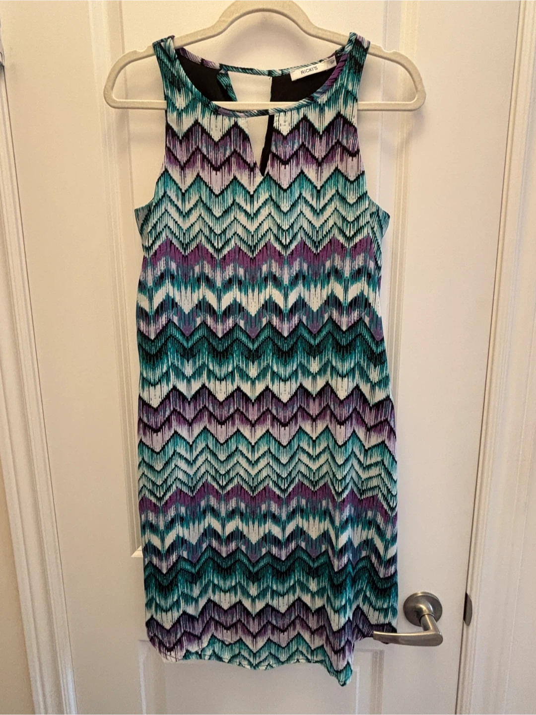 Selling a gently used Rickis sleeveless dress in size small. It features a vibrant, geometric pattern with shades of teal, purple, and white. Perfect for a casual outing or a summer event!