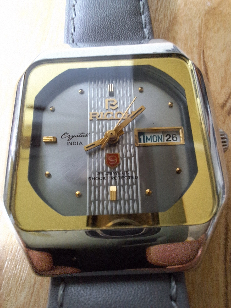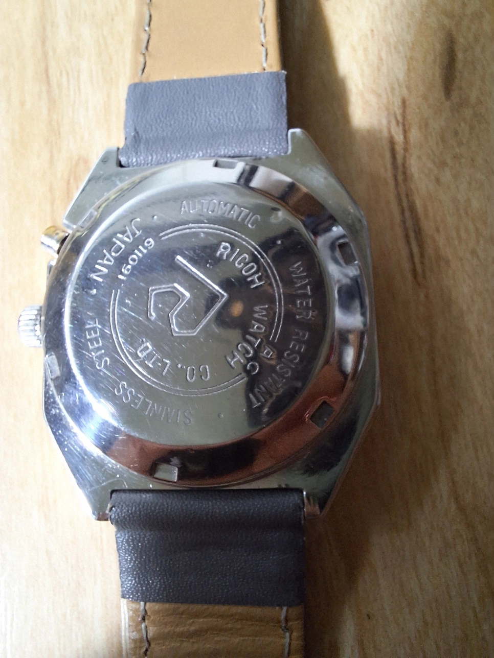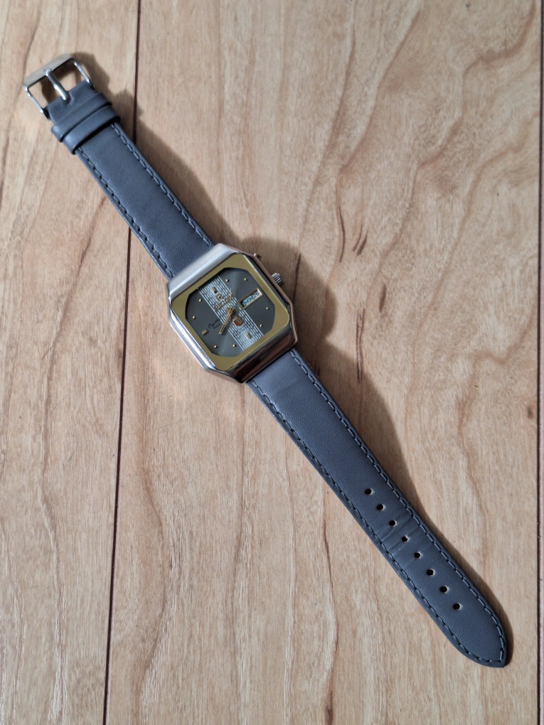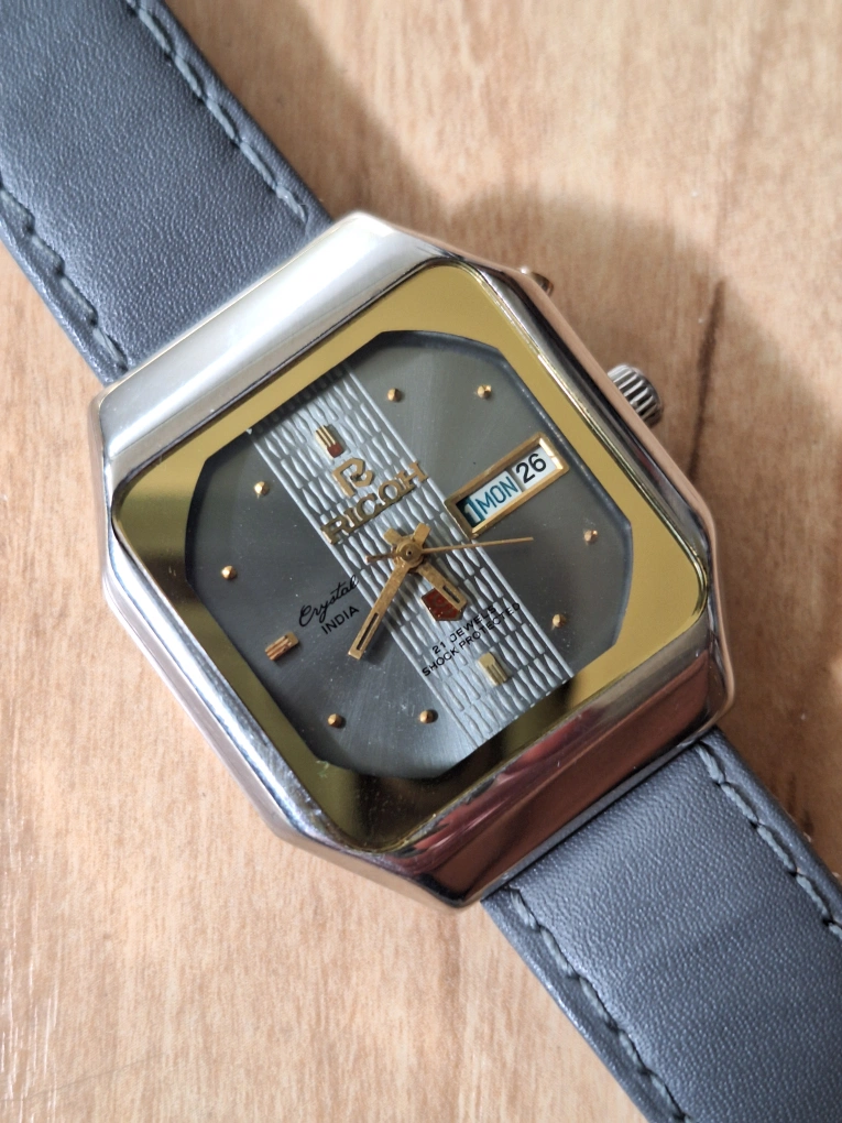 Selling a vintage Ricoh automatic watch. Features a unique square face and a grey leather strap. The watch is in good condition for its age and would make a great addition to any collection.