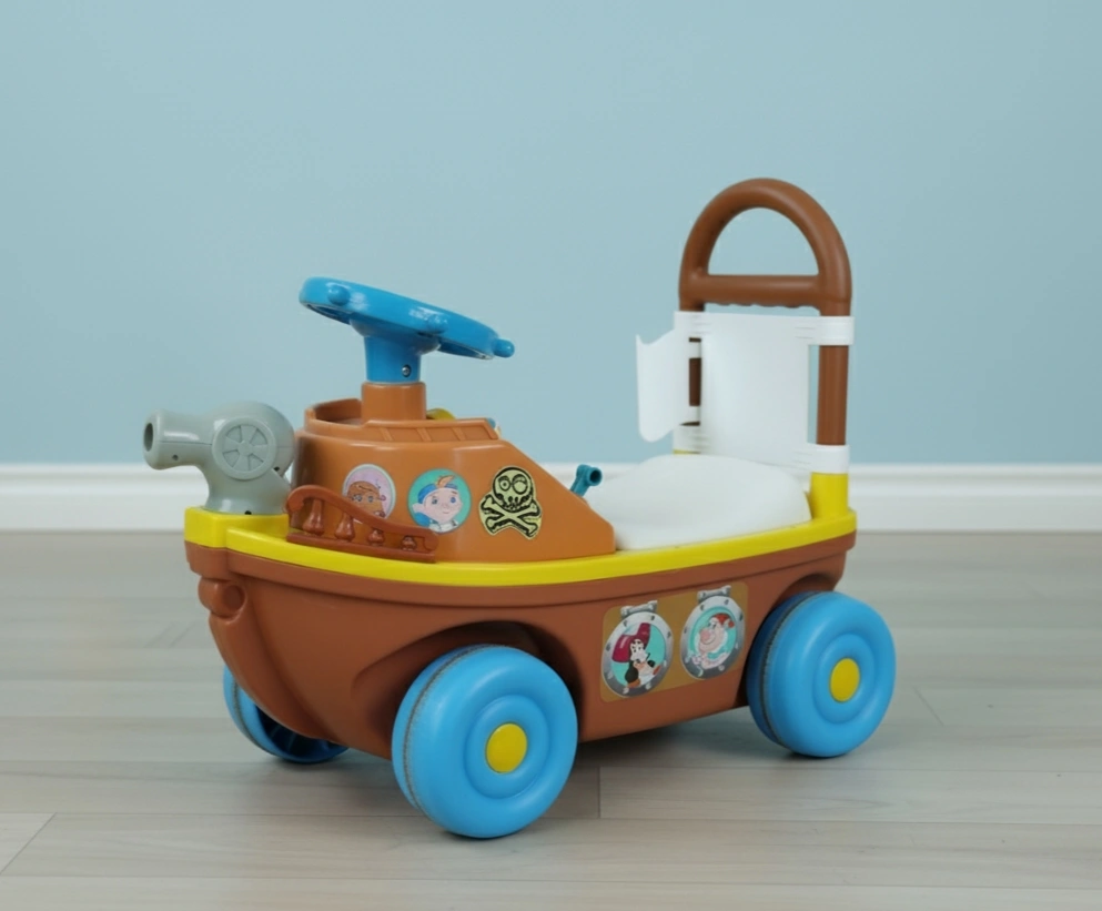 Fun pirate ship–style ride-on car for kids. In great used condition, well cared for. Music and sound features all work perfectly (needs 2 AA batteries, batteries not included). ✅ Real steering wheel that turns ✅ Clean and sturdy ✅ Fully functional ✅ Perfect for indoor play & little adventurers