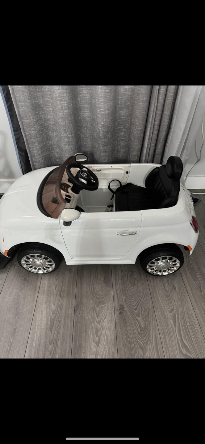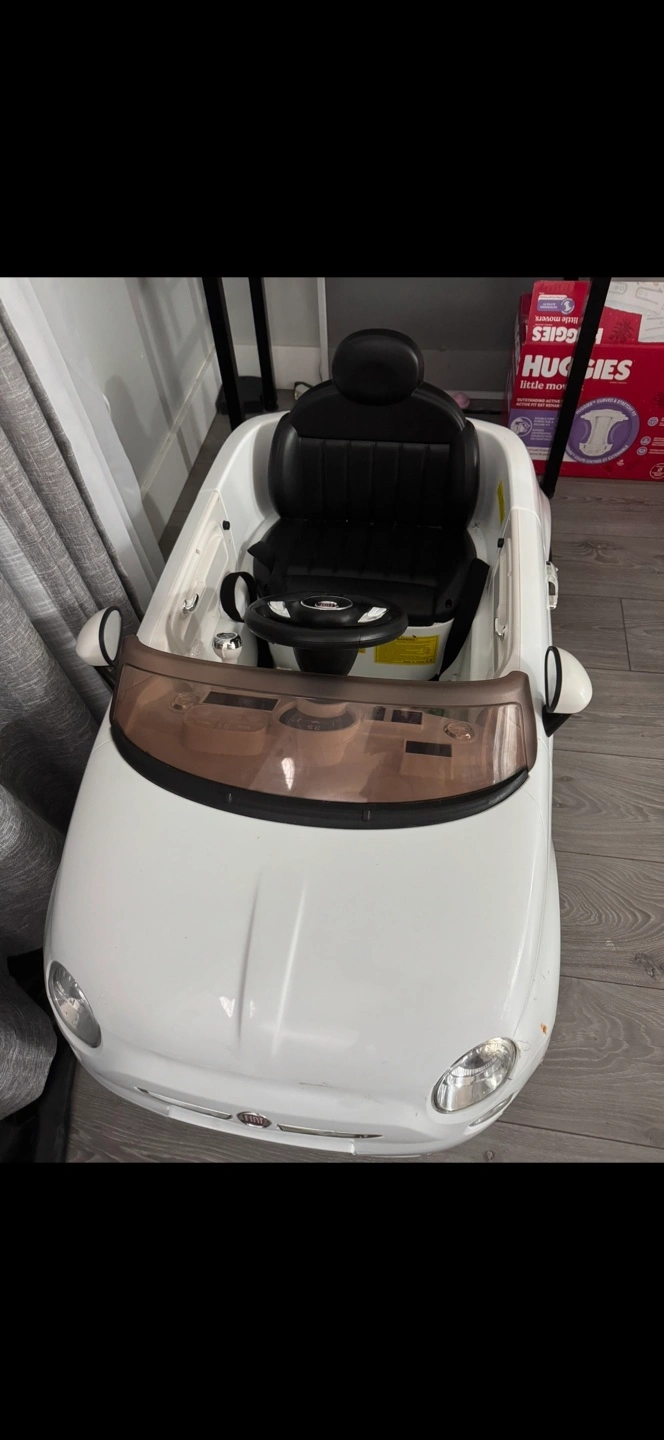 A white ride-on toy car. Chrome-looking wheels. Brown windshield. Black seat and steering wheel. A great item for a fun playtime session. Comes with a remote control. In good condition. I can do delivery.