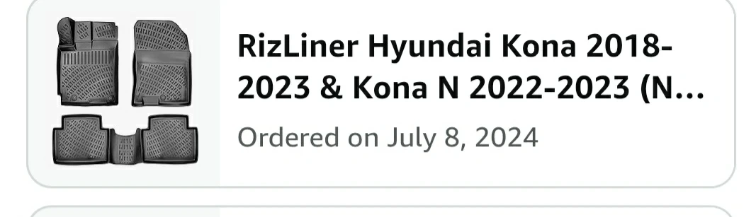 Selling a set of RizLiner floor mats for a Hyundai Kona (2018-2023) and Kona N (2022-2023). They were ordered on July 8, 2024 Brand new still in the box never opened