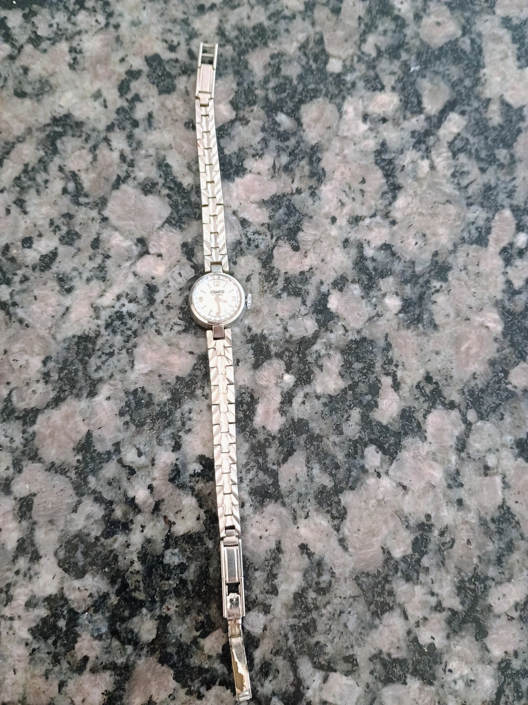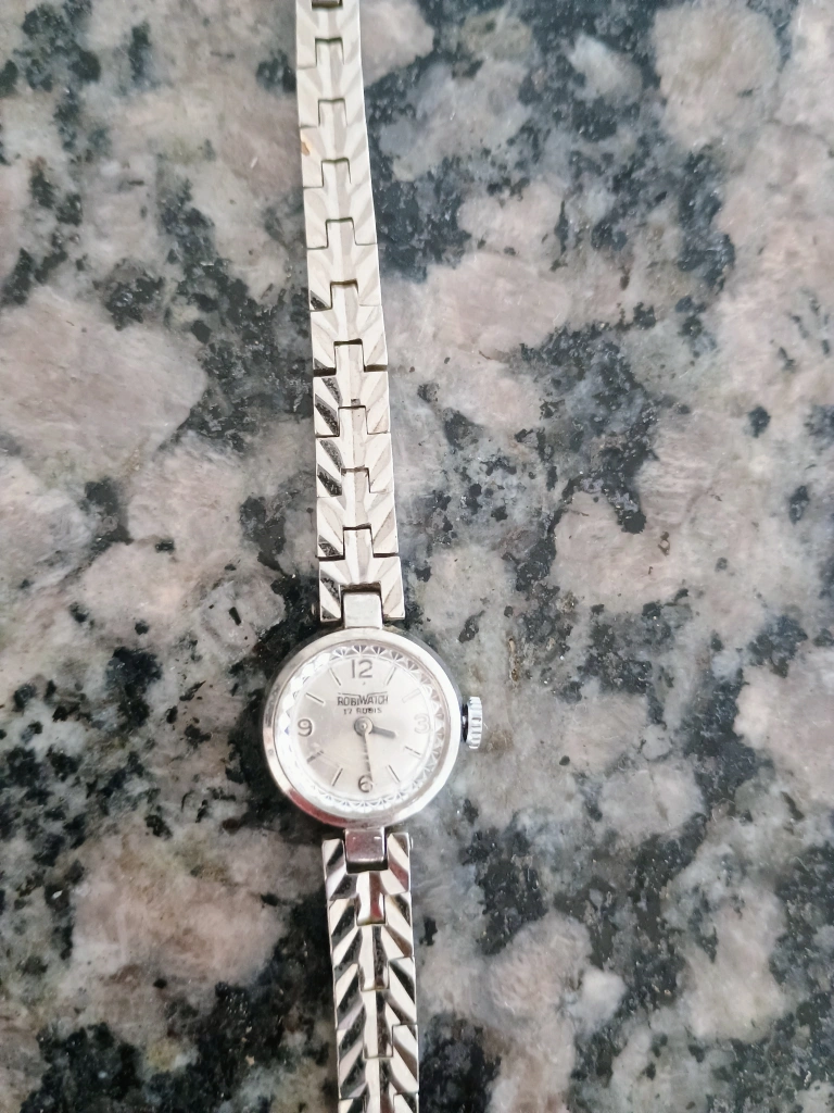 Selling a vintage Robin ladies wristwatch. It has a silver-tone band and a small, round face. A classic and elegant timepiece!