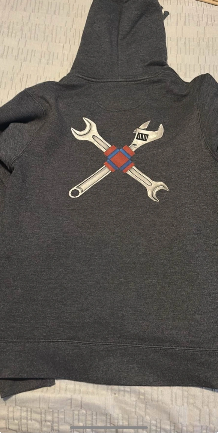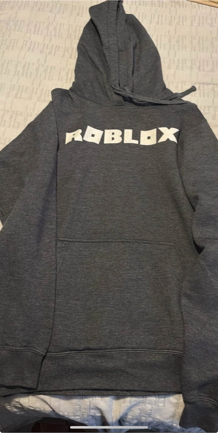 Selling a gray Roblox hoodie! It features the Roblox logo on the front and a wrench design on the back. It's in great condition and ready for a new home