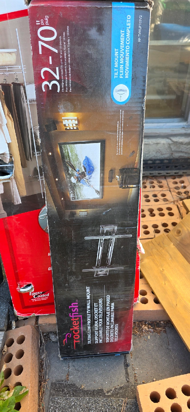 Selling a Rocketfish tilting low-profile TV wall mount. It supports TVs from 32 to 70 inches and up to 130 pounds. It's designed to be a discreet and inclinable wall mount for televisions.