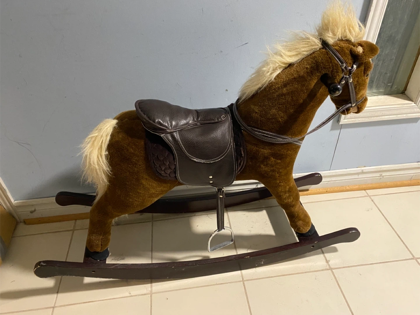 A lovely rocking horse for sale! It has a brown plush body with a dark brown saddle and wooden rockers. It's in good condition and ready for a new home! buttons on ears, one has galloping sound, the other has neighing sound. Brings much fun & joy to a little one. PICKUP ONLY Cash only