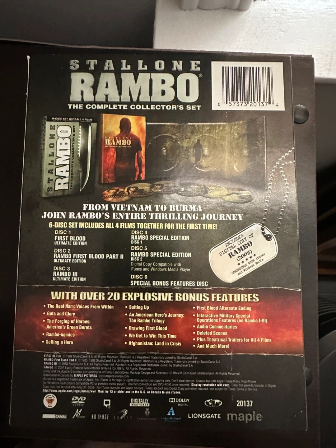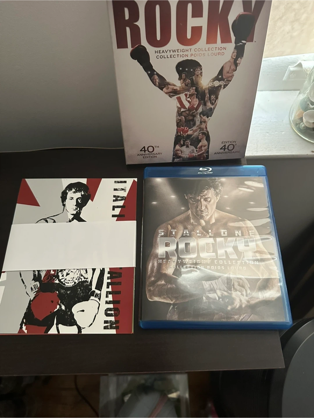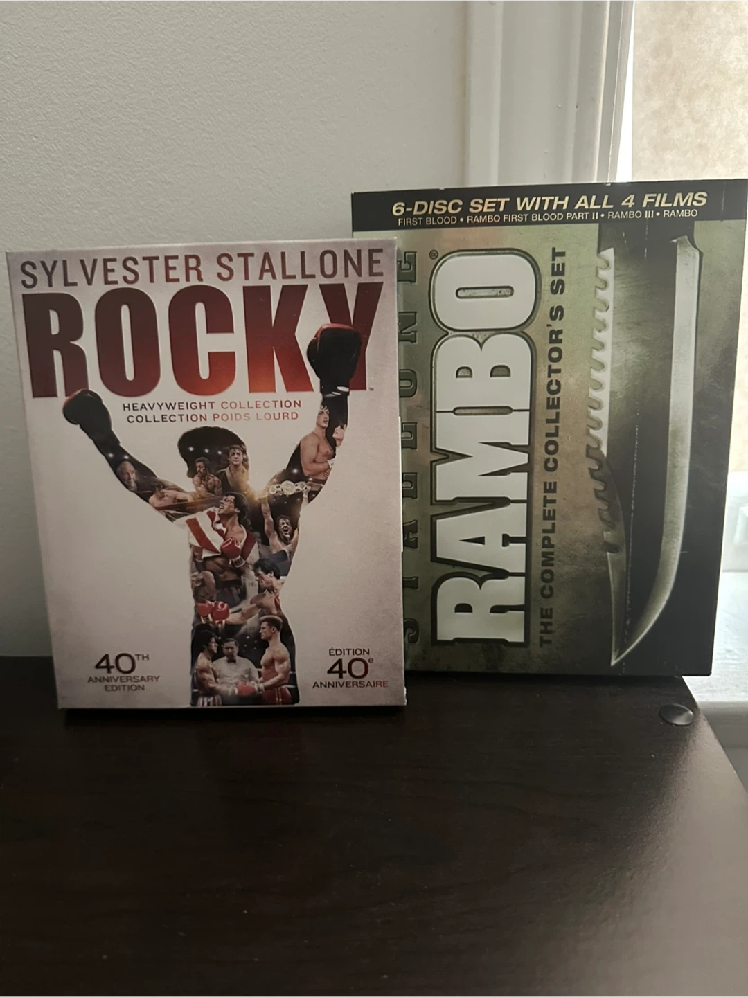 Selling a 6-disc set of Rocky and Rambo movies! This collector's set includes both the Rocky Heavyweight Collection 40th Anniversary Edition with mini collector poster cards and the Rambo Complete Collector's Set. Get ready for hours of action with Sylvester Stallone! Shrink wrap removed, DVDs have never been played mint condition, smoke free home