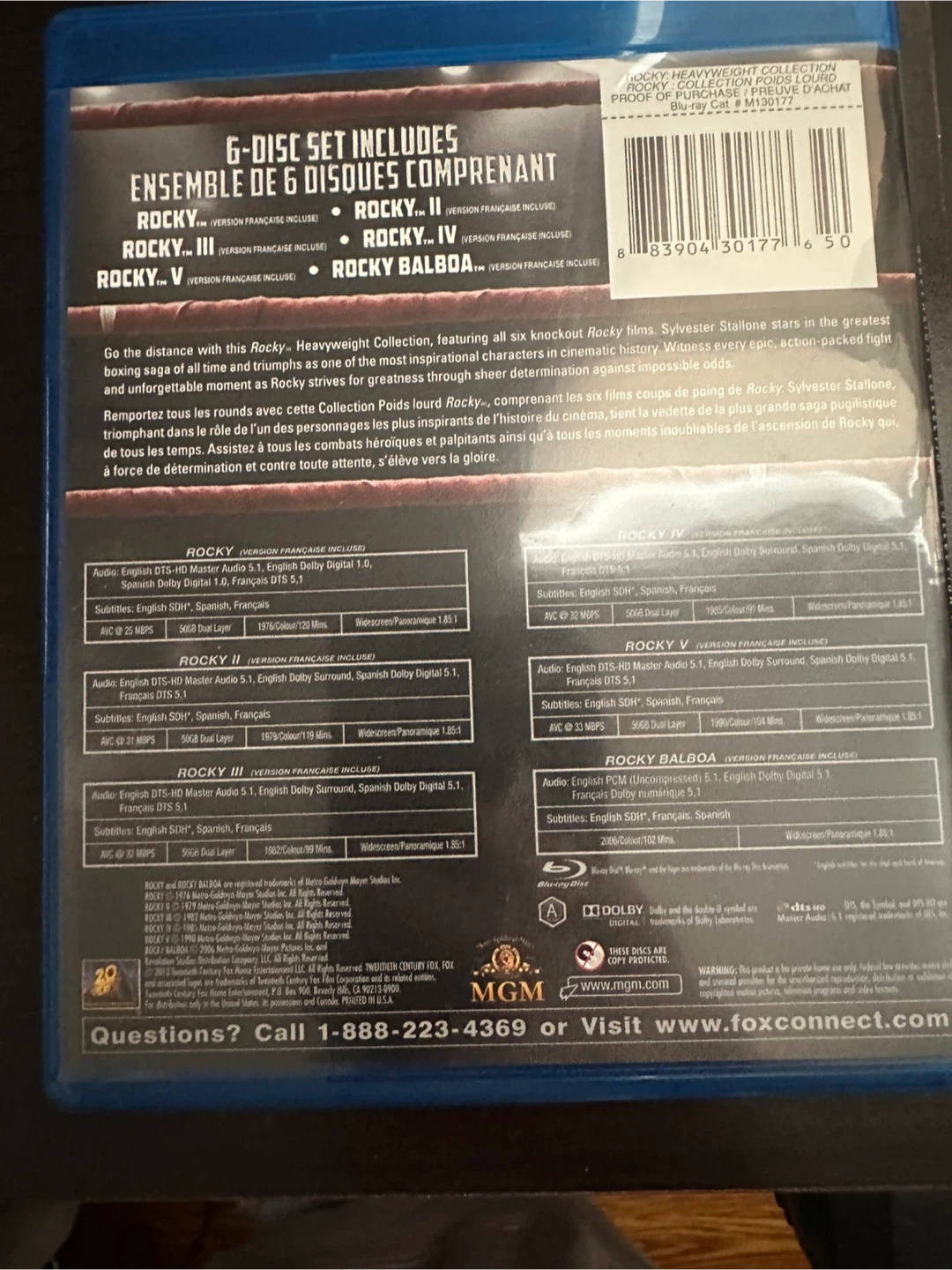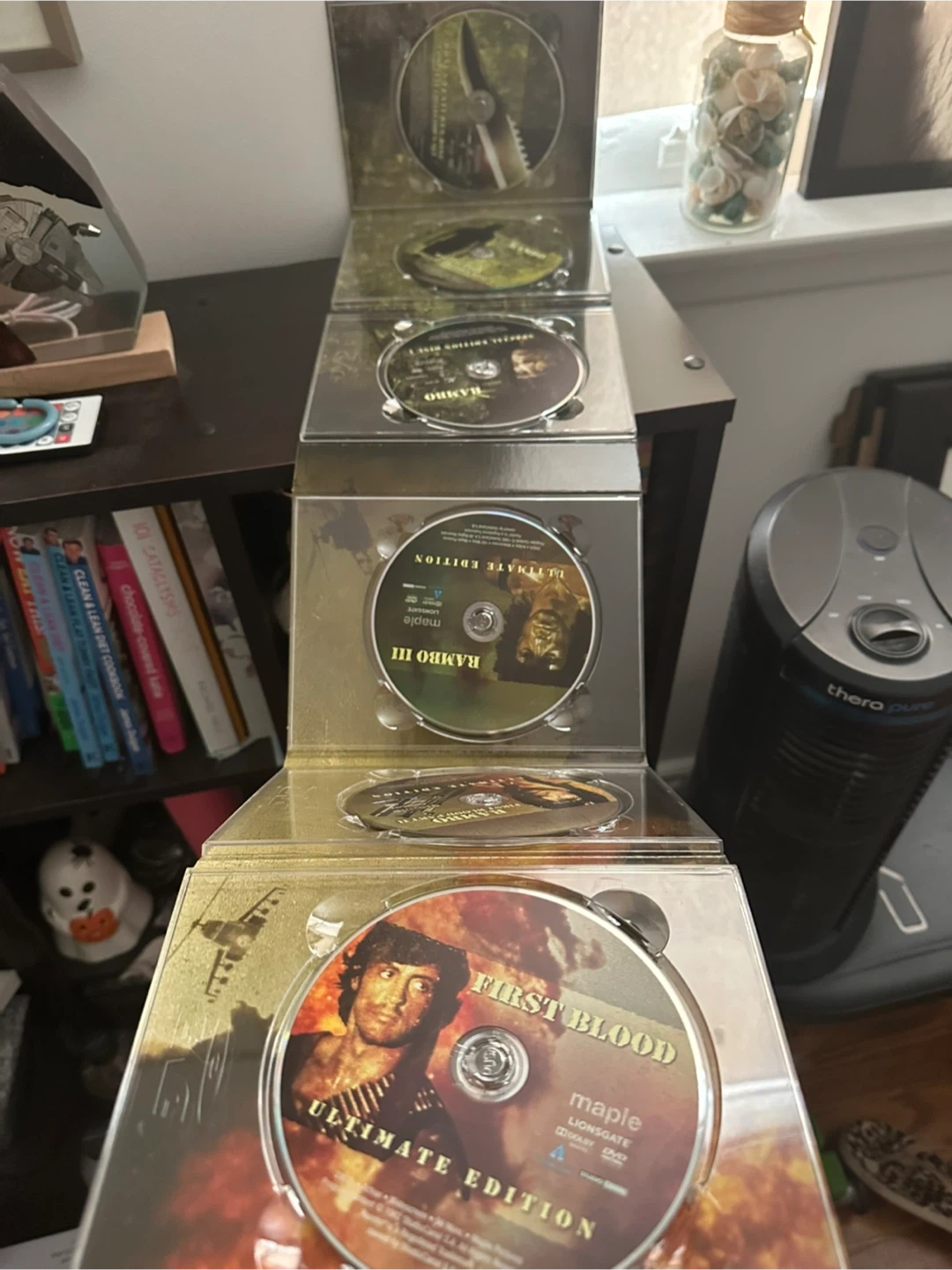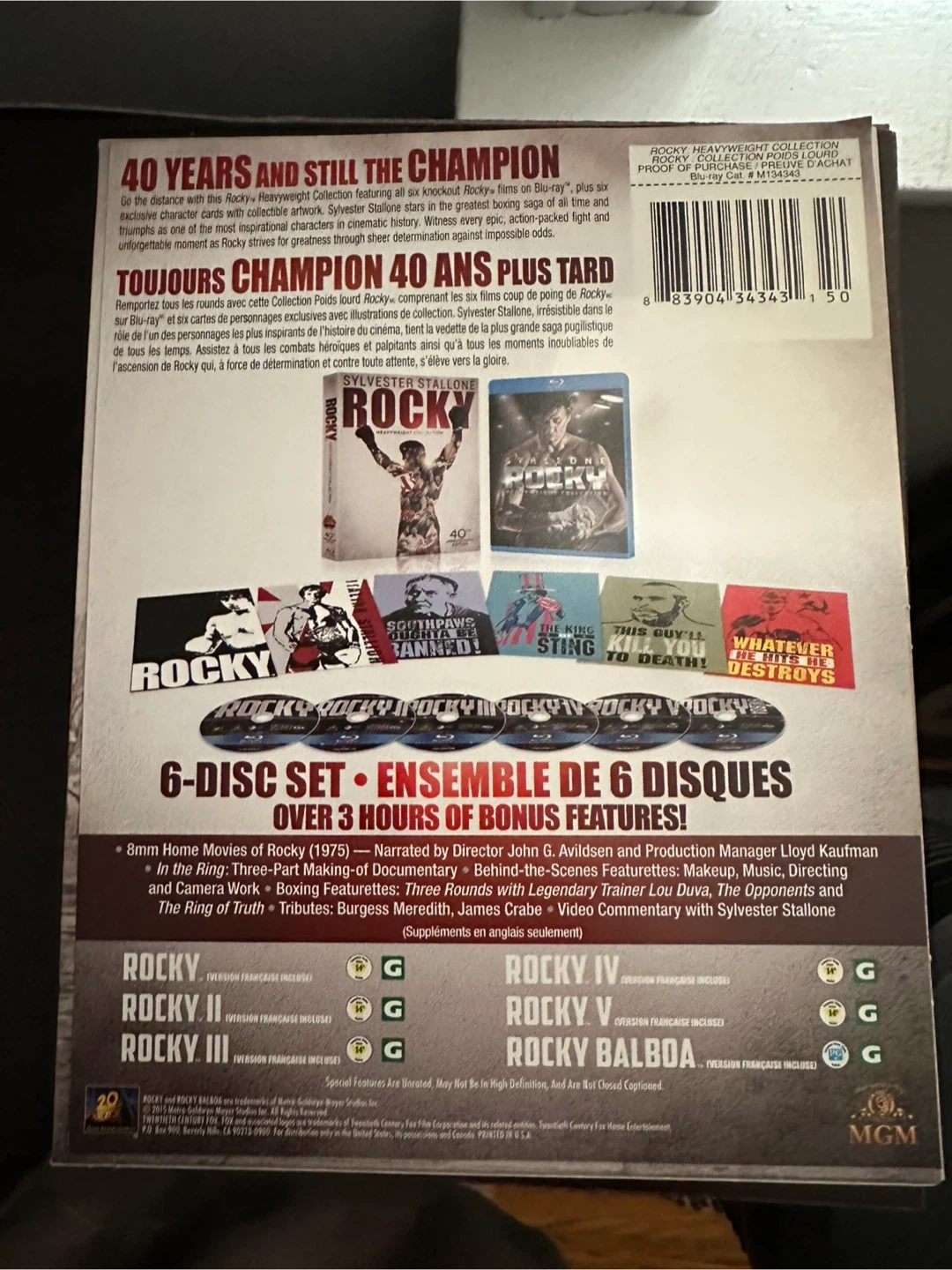 Selling a 6-disc set of Rocky and Rambo movies! This collector's set includes both the Rocky Heavyweight Collection 40th Anniversary Edition with mini collector poster cards and the Rambo Complete Collector's Set. Get ready for hours of action with Sylvester Stallone! Shrink wrap removed, DVDs have never been played mint condition, smoke free home