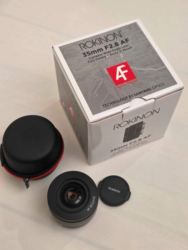 Selling a Rokinon 35mm f2.8 autofocus full frame lens for Sony E mount. This compact wide-angle lens is in excellent condition and delivers sharp, clear images, perfect for everyday photography. Key Features: * Focal Length: 35mm * Aperture: f/2.8 * Mount: Sony E-mount * Full Frame Compatible * Autofocus I'm asking $350. From my research on Kijiji, this is a competitive price. If the ad's up, it's still available, so feel free to reach out!