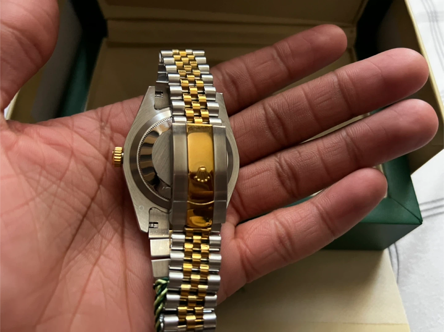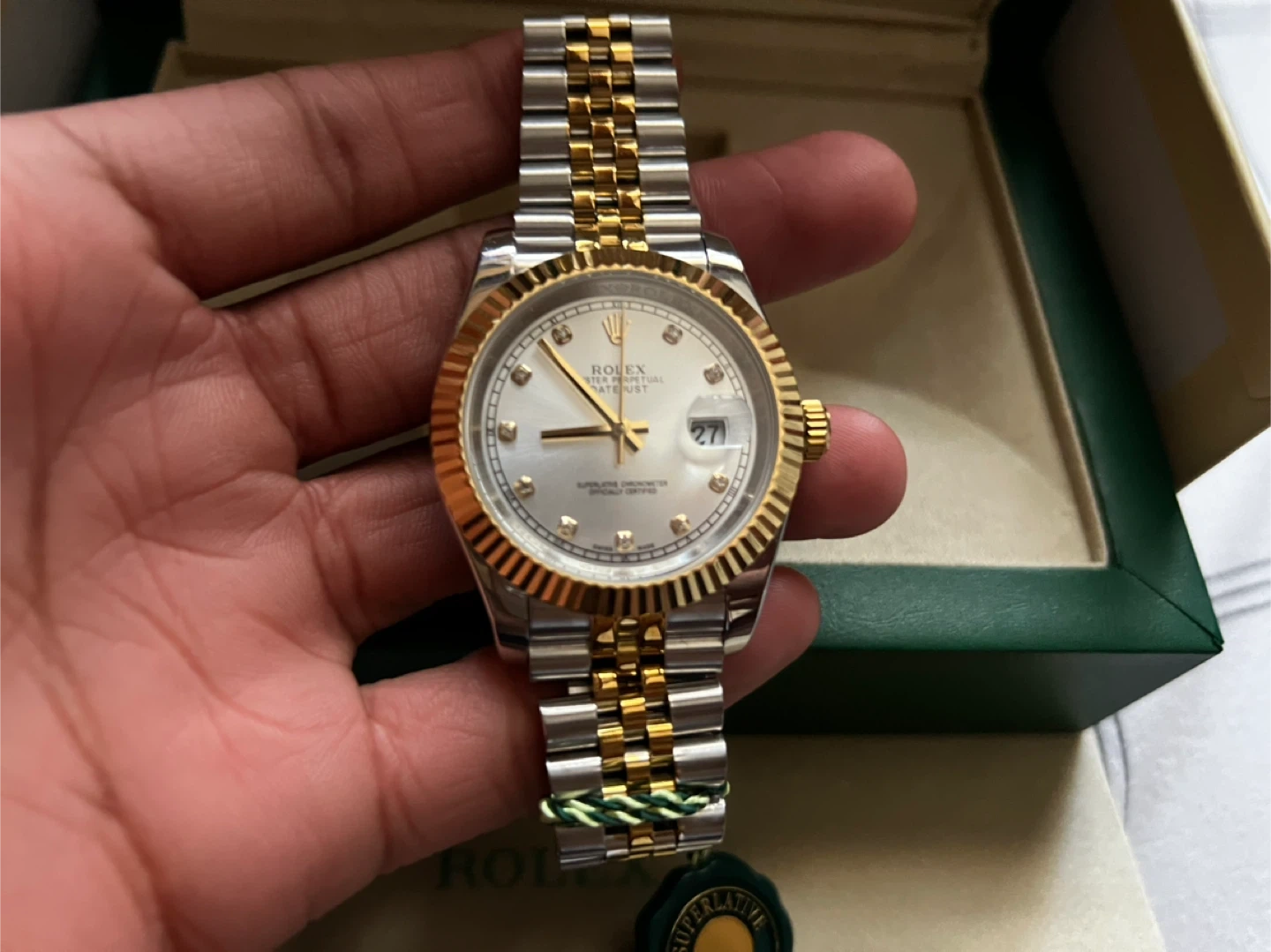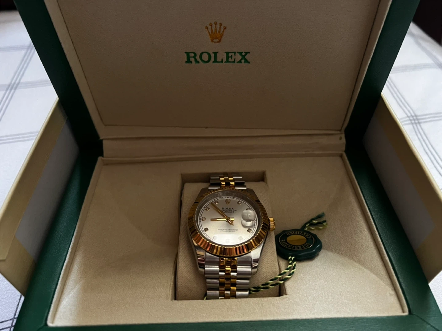 Selling a beautiful Rolex Datejust. It's a two-tone model with a fluted bezel and a jubilee bracelet. Comes with the original box.