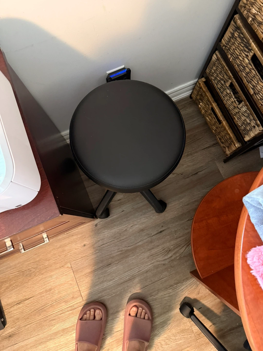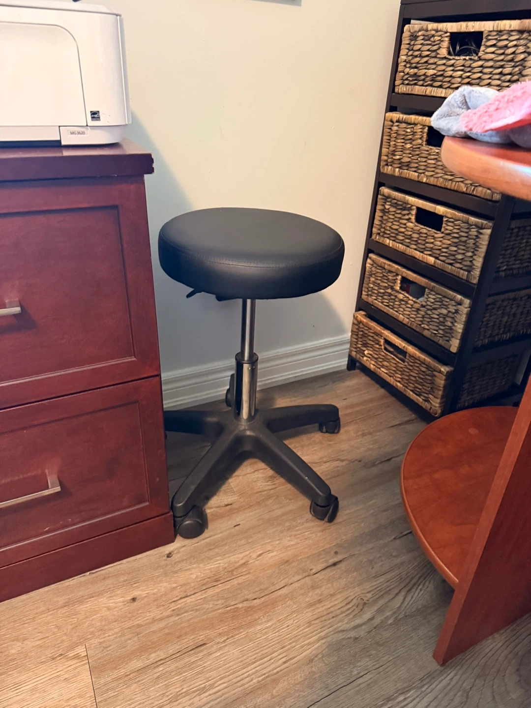 Selling a gently used rolling swivel stool in black. It's perfect for a variety of uses around the house or in a small workspace. The stool is height adjustable and has a comfortable padded seat. It rolls smoothly and is in great shape!