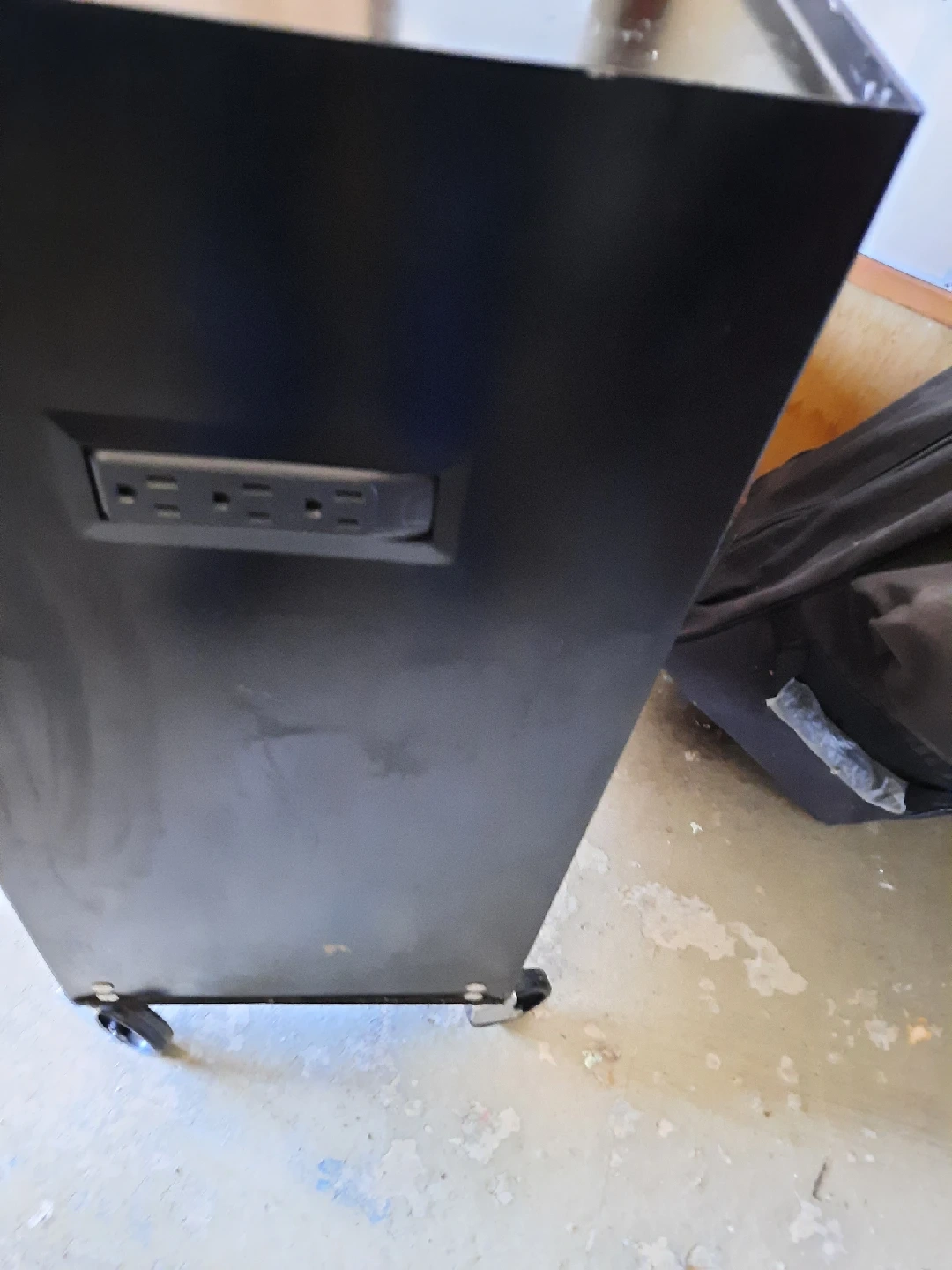 Tool cabinet on wheels, perfect for organizing your workspace! It features a black frame with grey doors, providing ample storage for your tools and equipment also is wired with plugs in the side panels only available for pickup