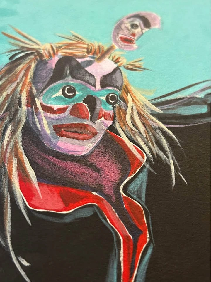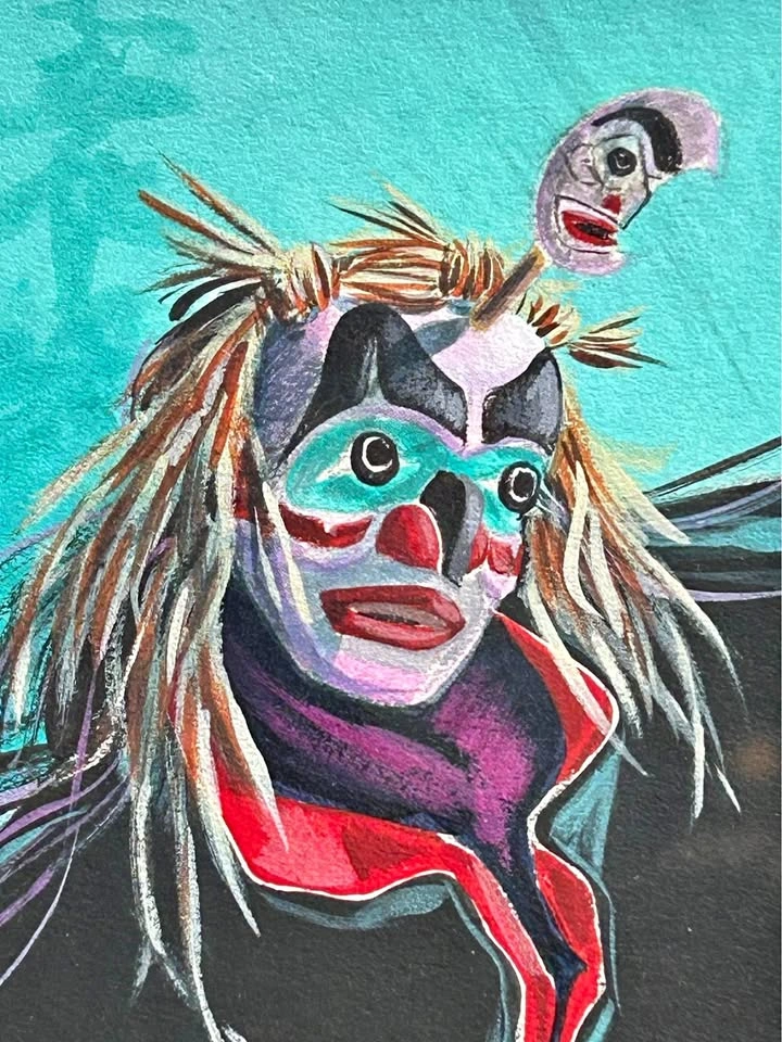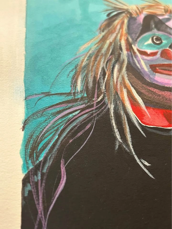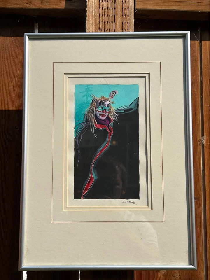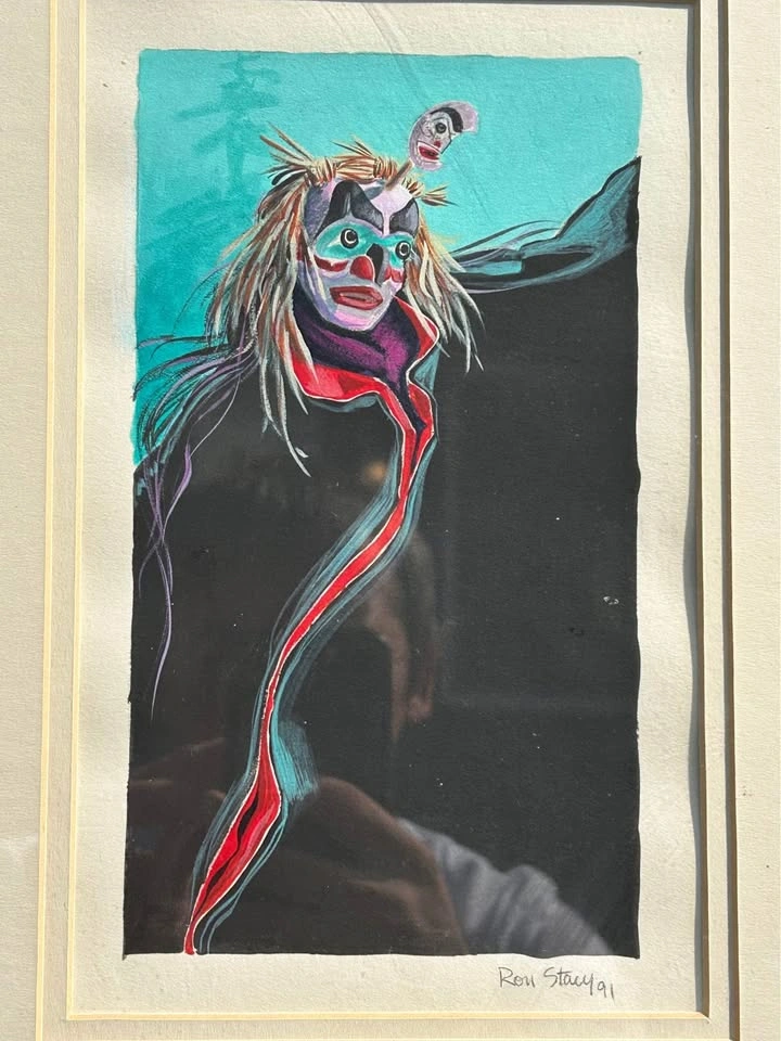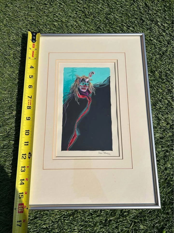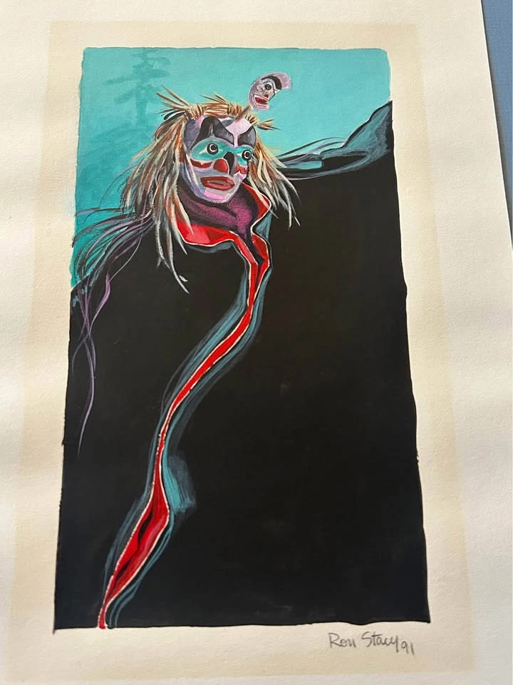 Original watercolour on paper by Canadian artist Ron Stacy (b. 1943). Signed and dated 1991. Features a dramatic mask spirit figure with turquoise and red accents, elongated flowing form, matted and framed under glass. Collectible and unique artwork. Pick up: Seton area, Calgary. See also my other lots. Open to your questions and suggestions. If necessary, I provide additional photos. These are not new things, so please look carefully at the photos and videos. Sizes are submitted on request and also using a tape measure in the photo.