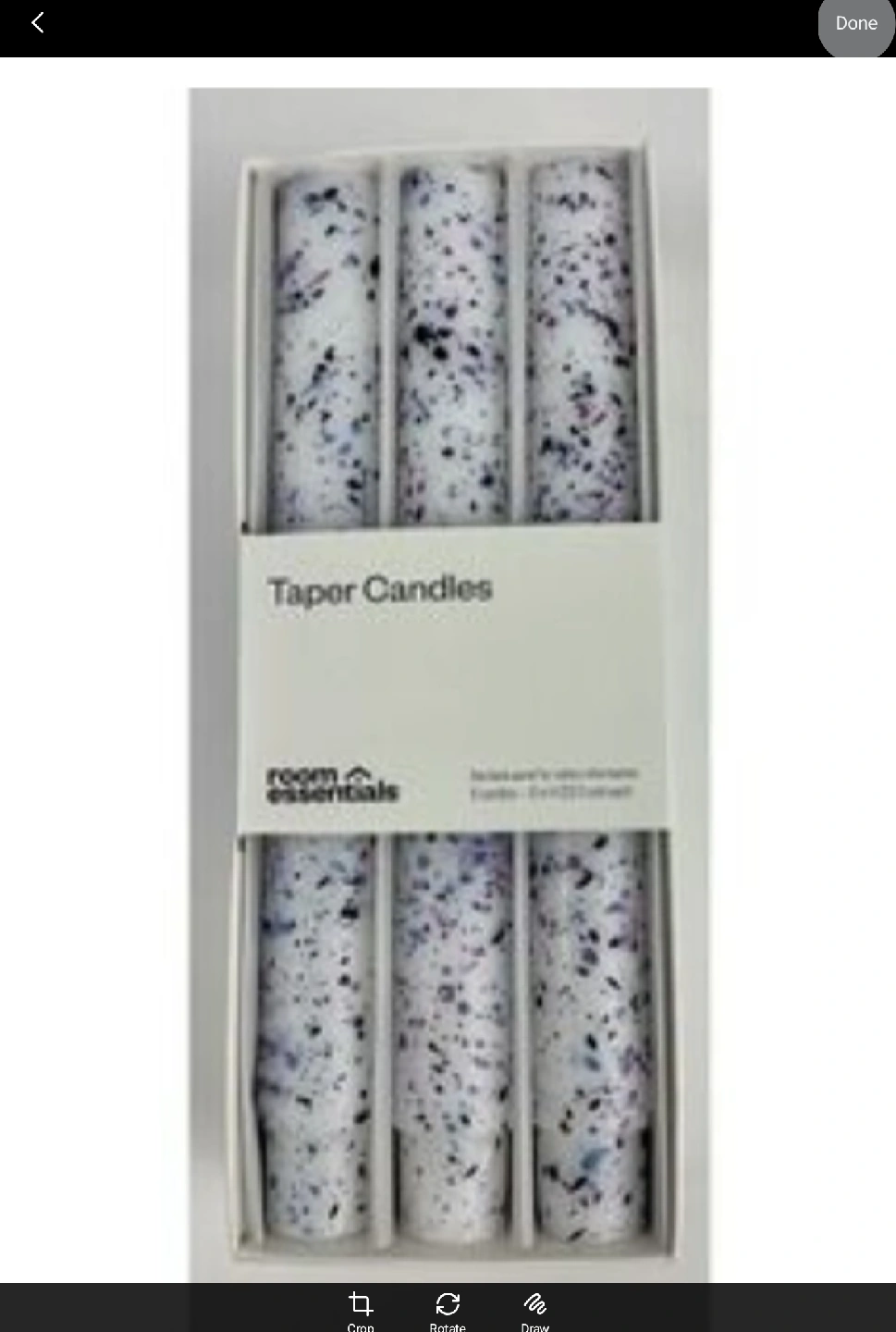 6 pack Room Essentials taper candles. These candles feature a lovely blue speckled design. Perfect for adding a touch of elegance to any room Pick up at Yonge & Steeles