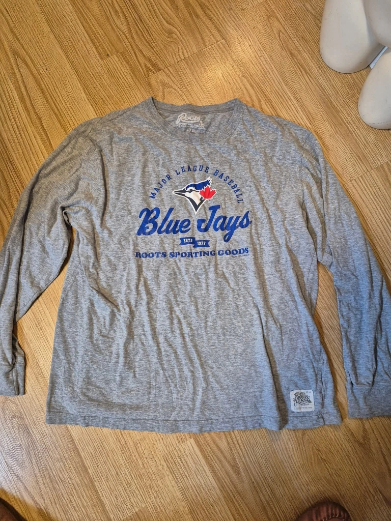 Selling a Roots long-sleeve shirt featuring the Toronto Blue Jays logo! This shirt is a light grey colour and is a size large. It's in great condition and ready for a new home! MENS ROOTS TORONTO BLUE JAYS LONG SLEEVE..SIZE L..VGUC(some cracking in screen letters)