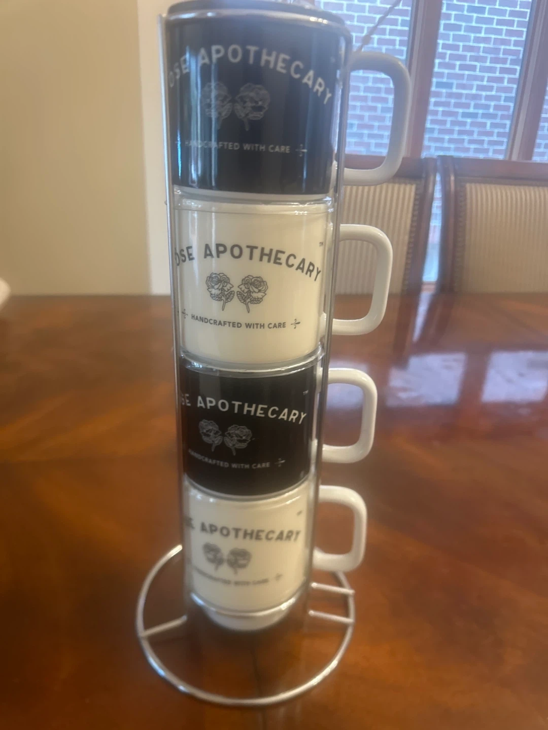 Selling a set of 4 stackable mugs from Rose Apothecary! These mugs are black and white and say "Handcrafted with Care" with a rose logo. Perfect for any Schitt's Creek fan!