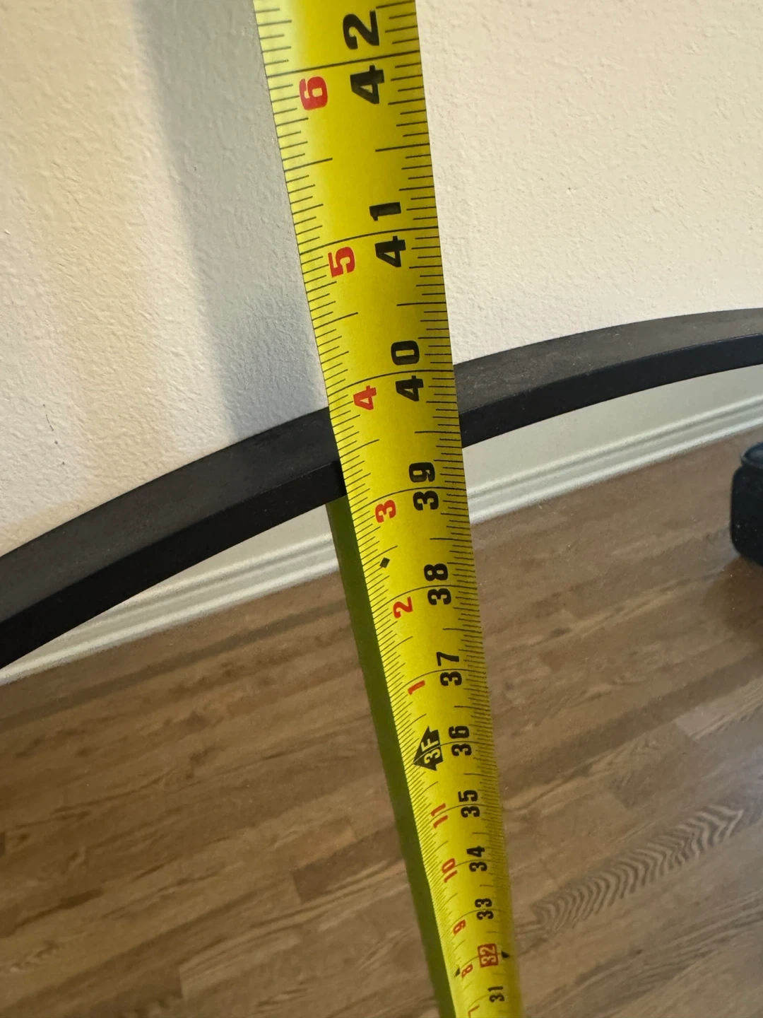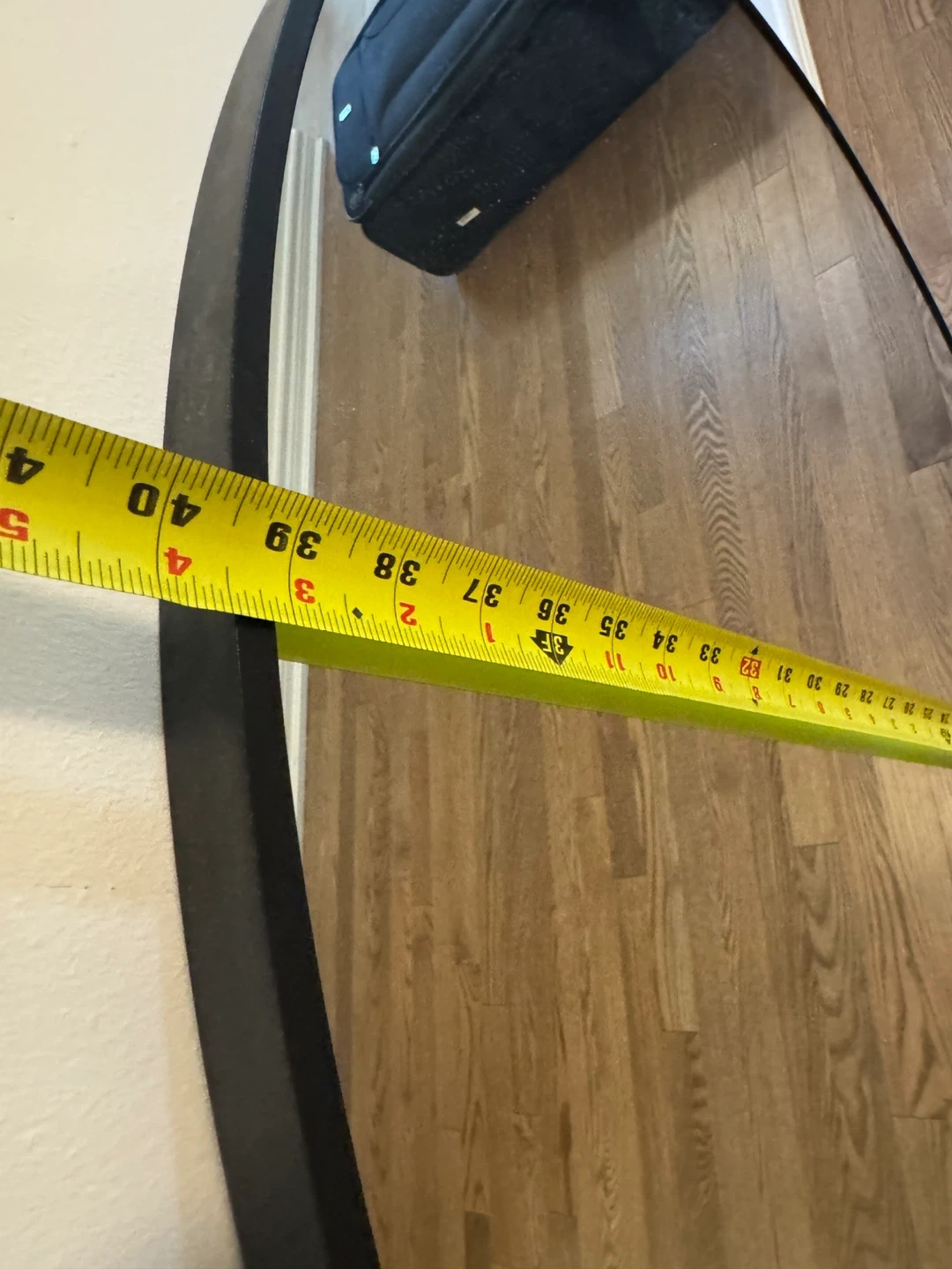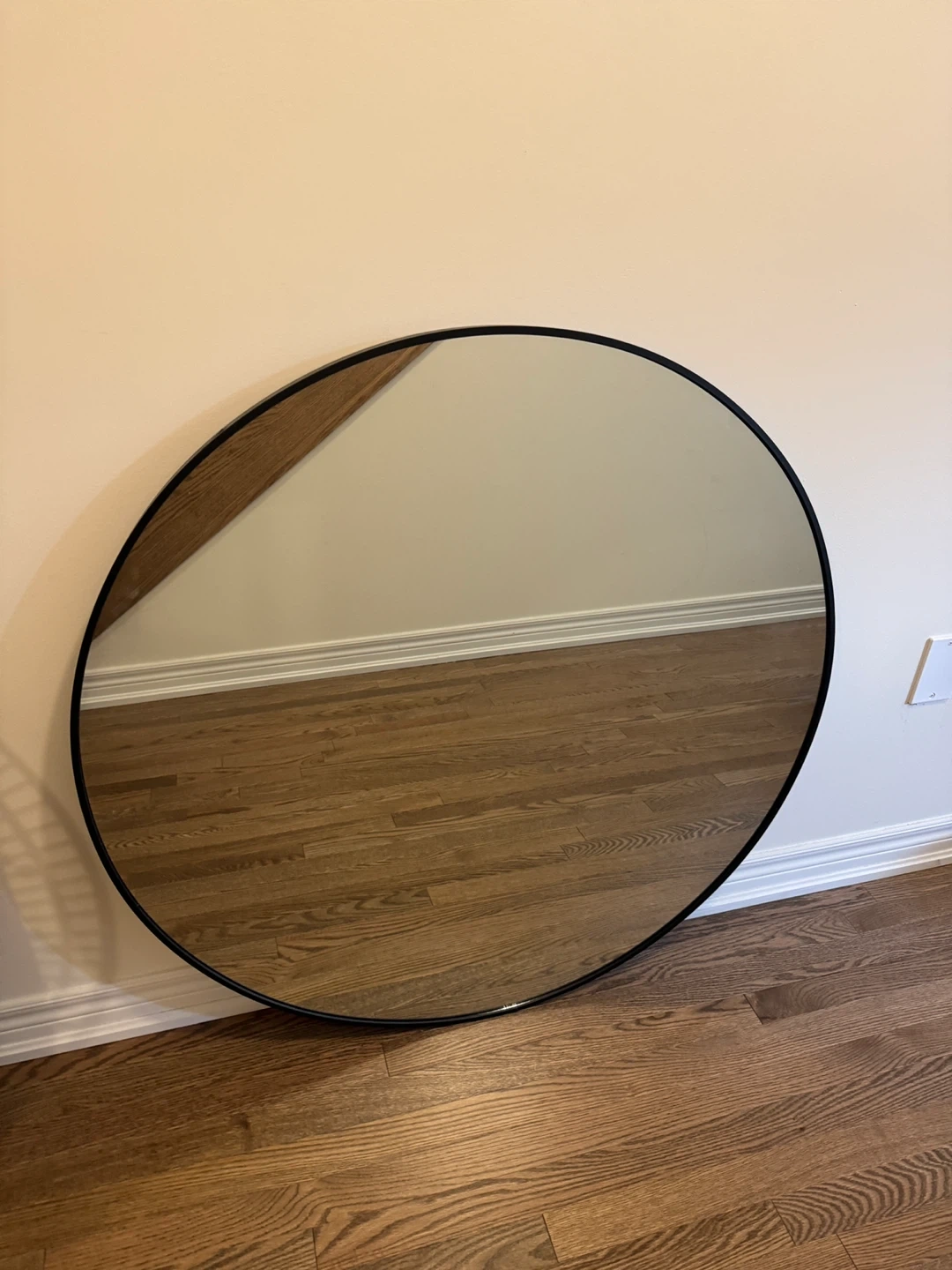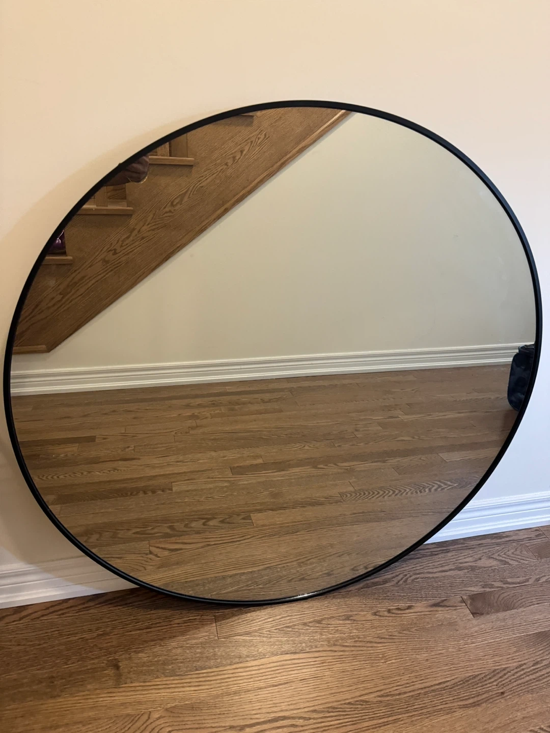Selling a round mirror with a sleek black frame! It measures approximately 40 inches in diameter. It would look great in any room!