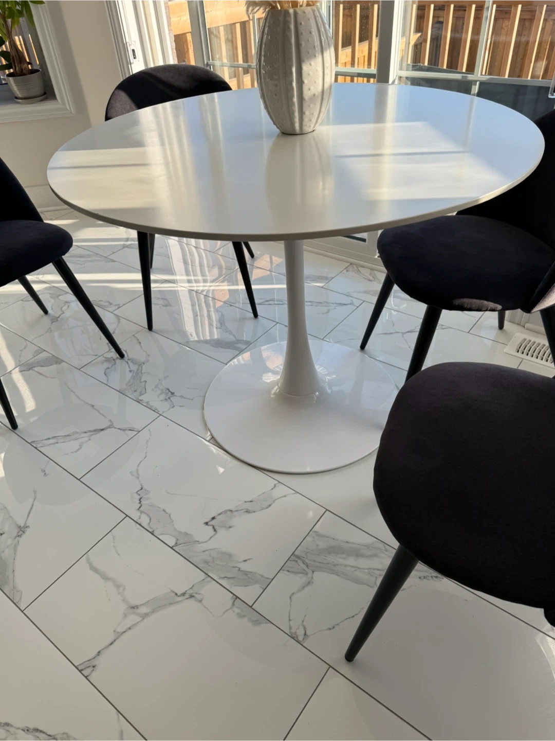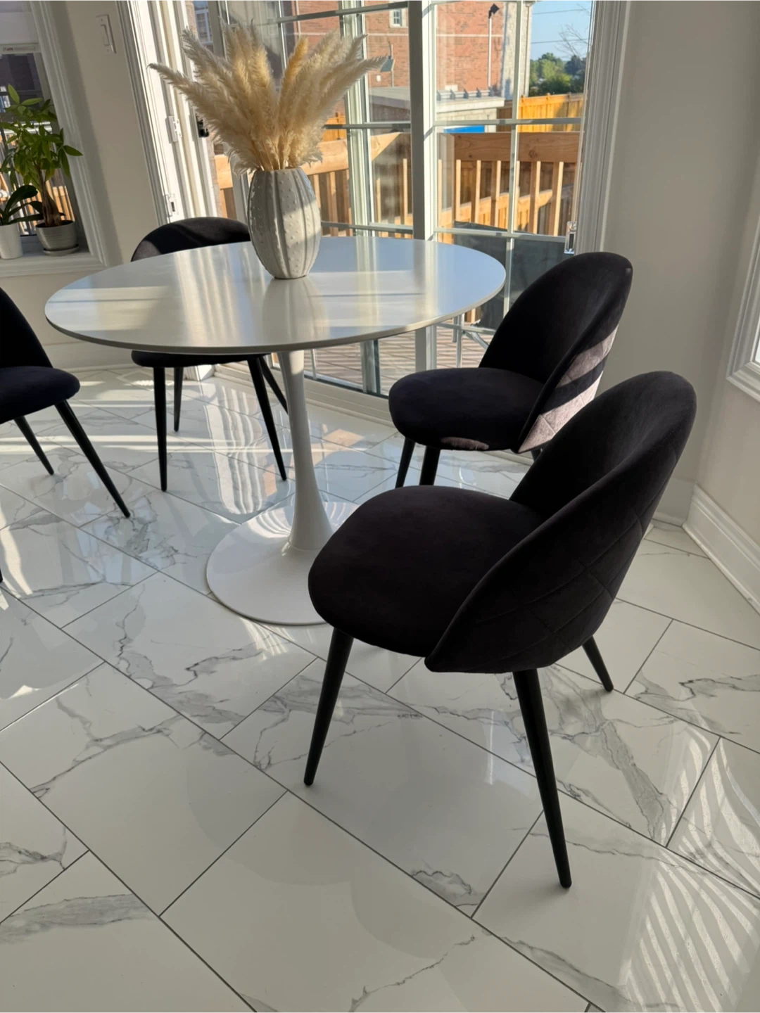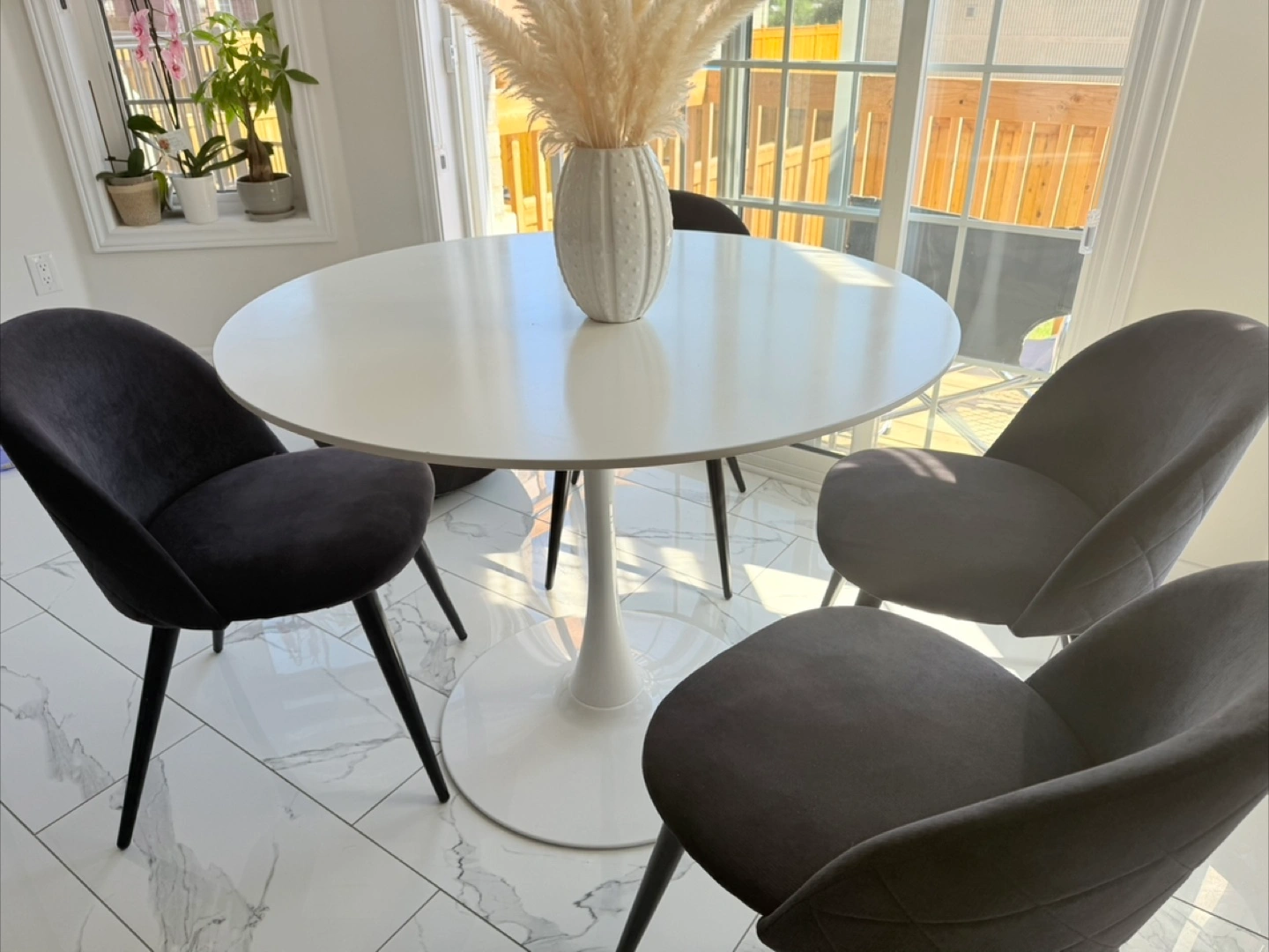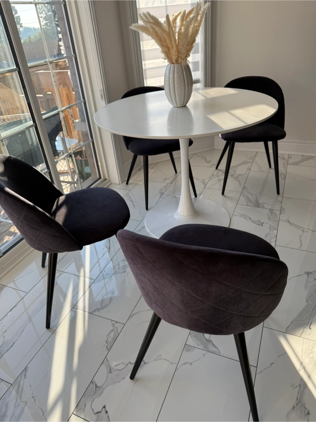 Selling a Wayfair round dining table that comes with four stylish velvet chairs. The table features a clean, white top and a sturdy base. The chairs are upholstered in a lovely black velvet, adding a touch of elegance to your dining space. Perfect for a small family or cozy gatherings! Bought from Wayfair Desandro dining table