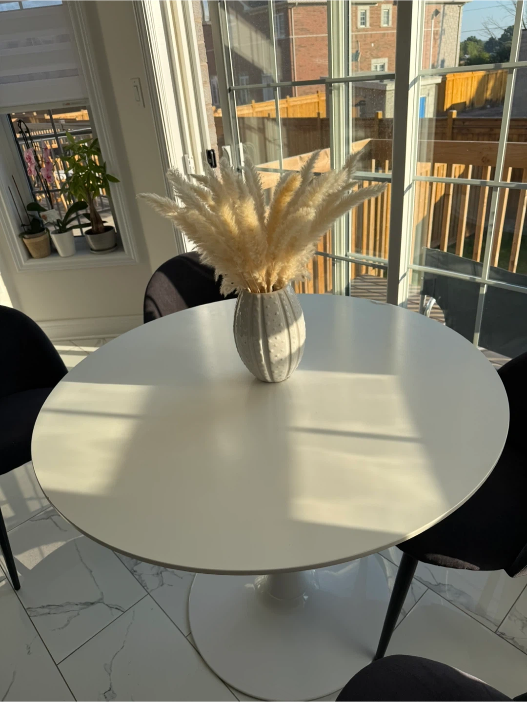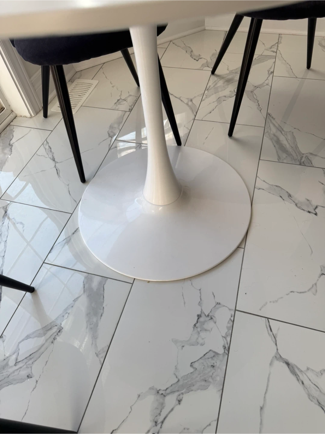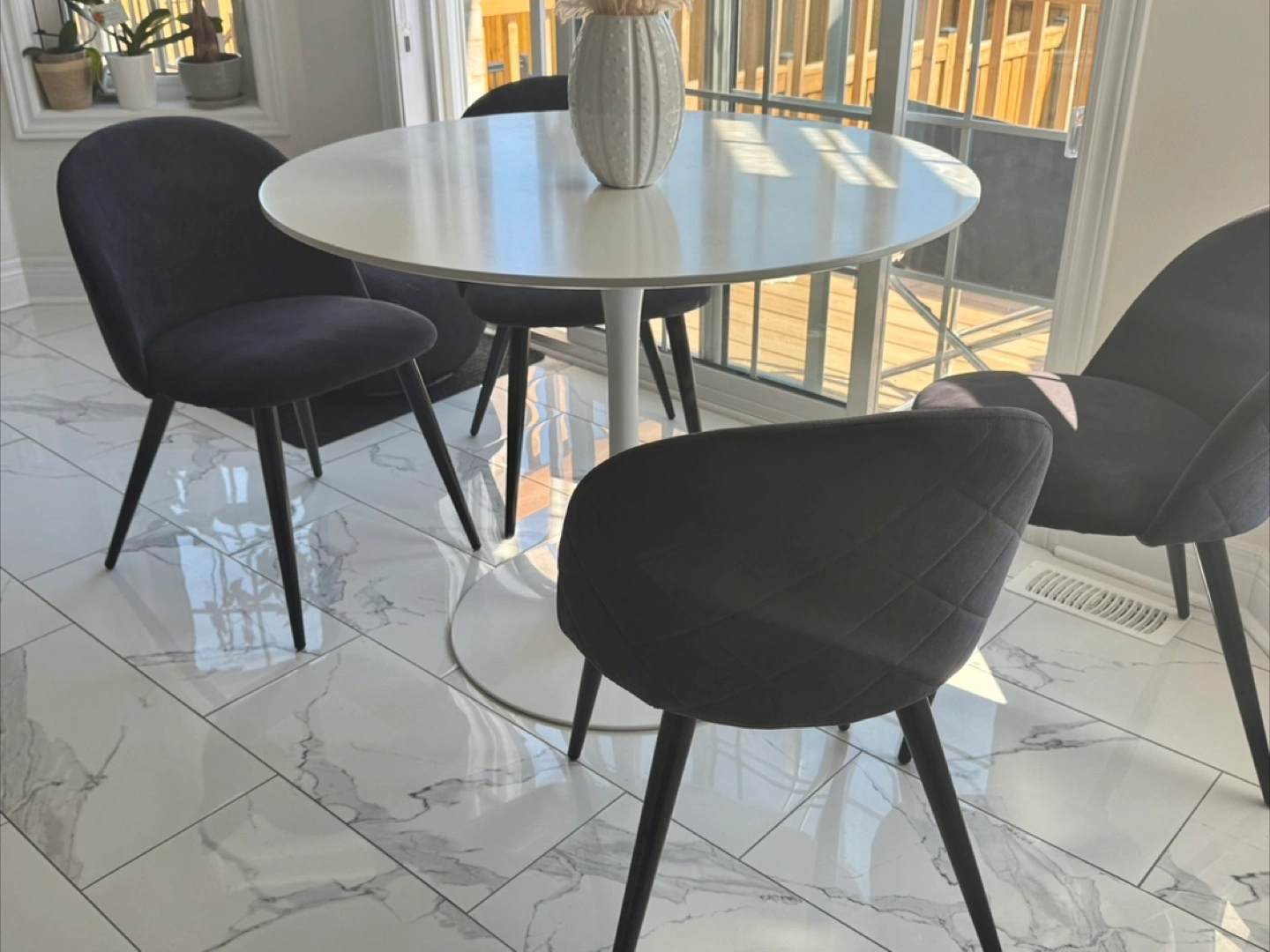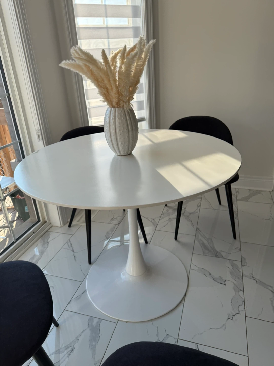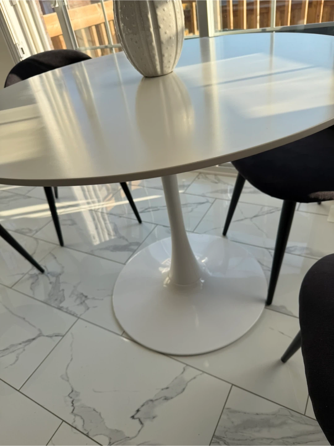 Selling a Wayfair round dining table that comes with four stylish velvet chairs. The table features a clean, white top and a sturdy base. The chairs are upholstered in a lovely black velvet, adding a touch of elegance to your dining space. Perfect for a small family or cozy gatherings! Bought from Wayfair Desandro dining table