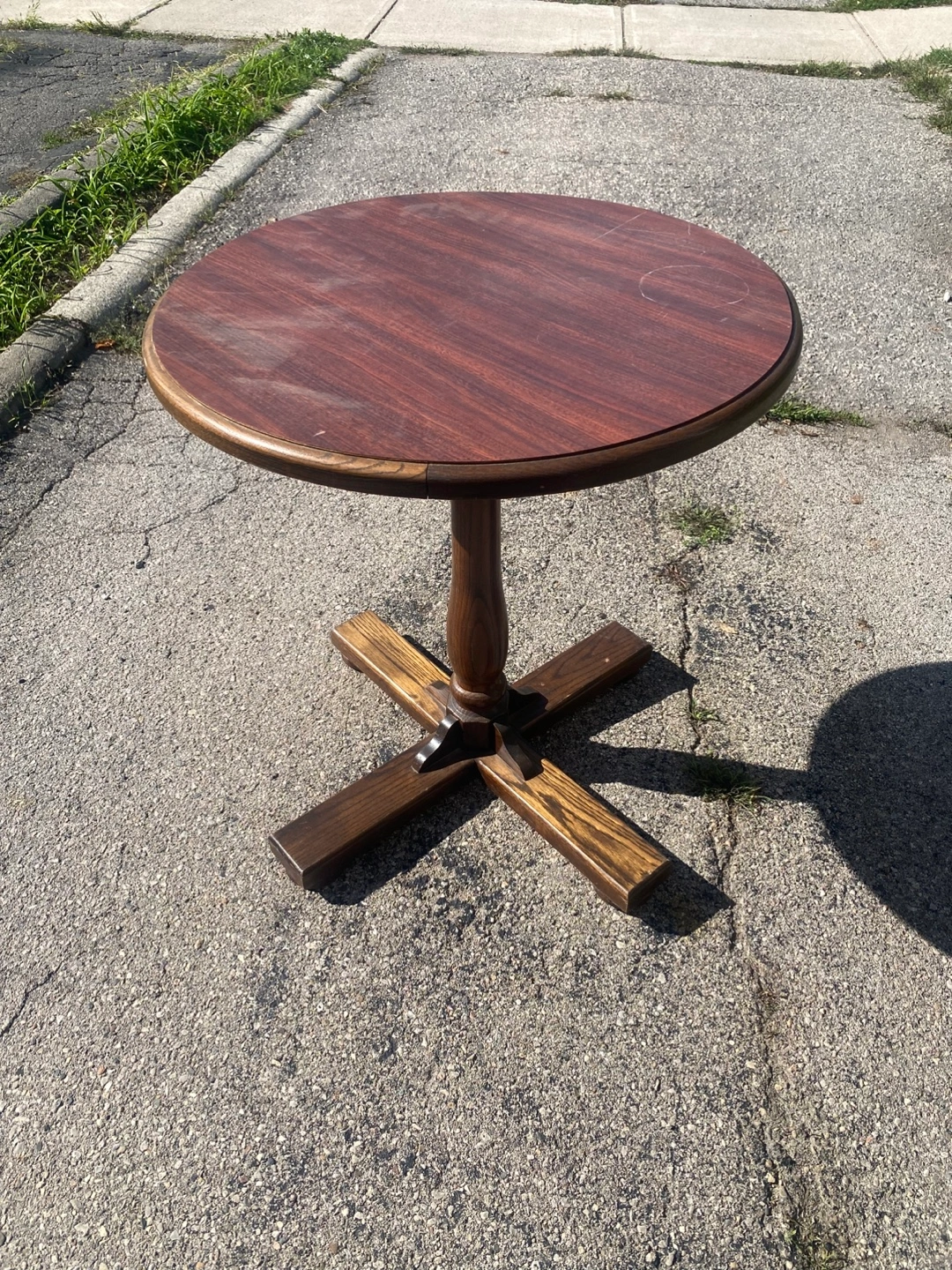 Selling a round wooden accent table. It has a classic design with a sturdy pedestal base. There are some minor scratches on the surface, but overall it's in good condition and ready to add a touch of warmth to your space