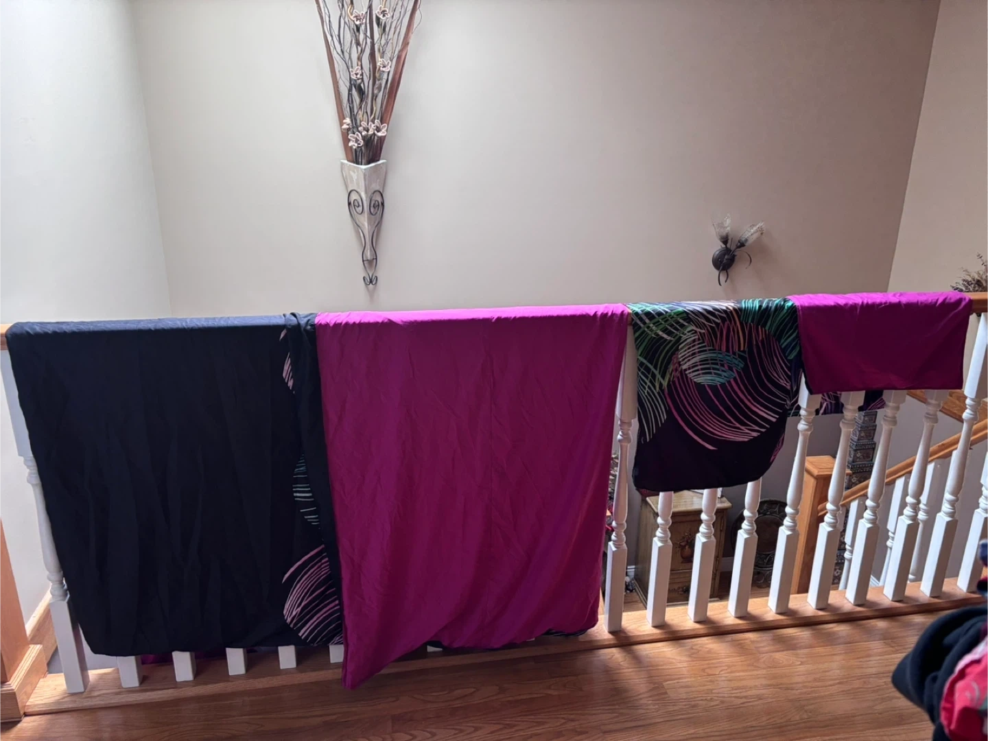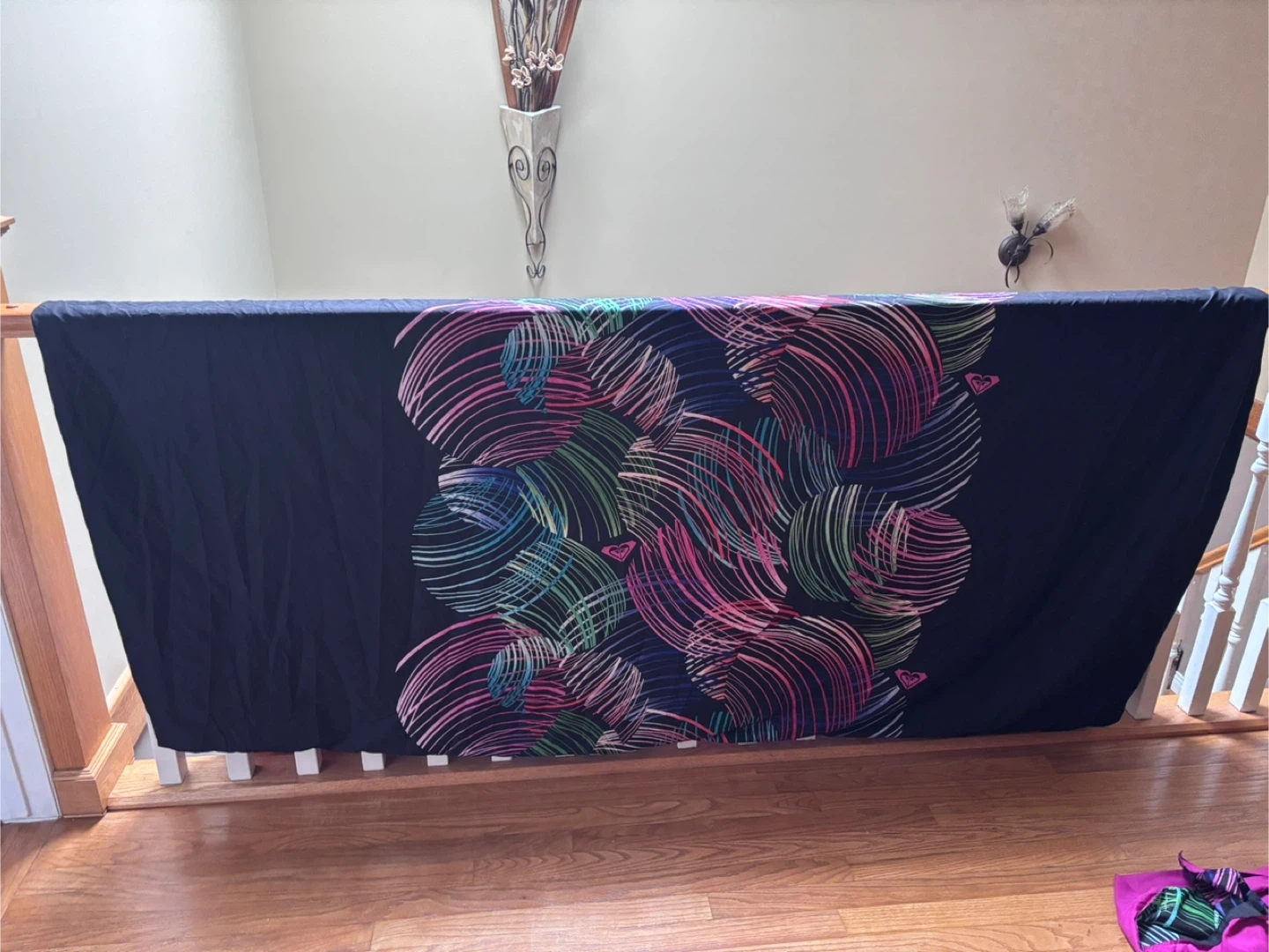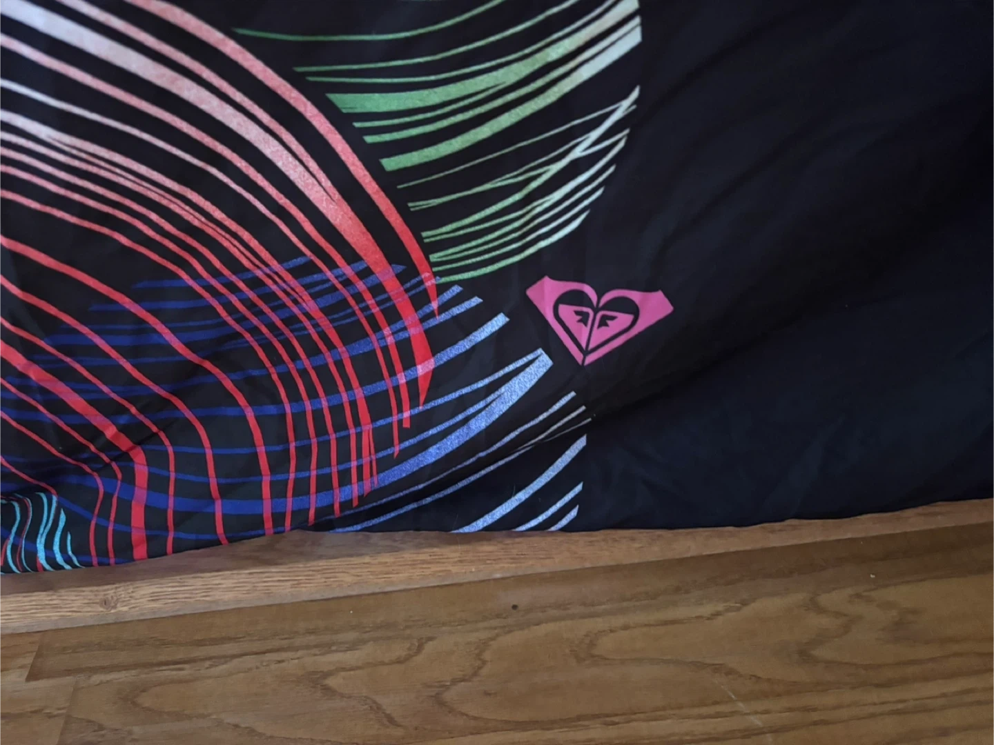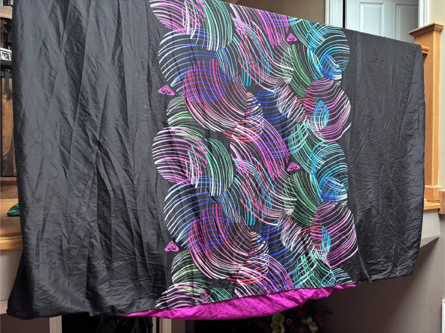 Selling a Roxy duvet cover in black and pink! It's in great condition. The design has a fun, colourful pattern, and the Roxy logo is visible throughout Satin/silk material