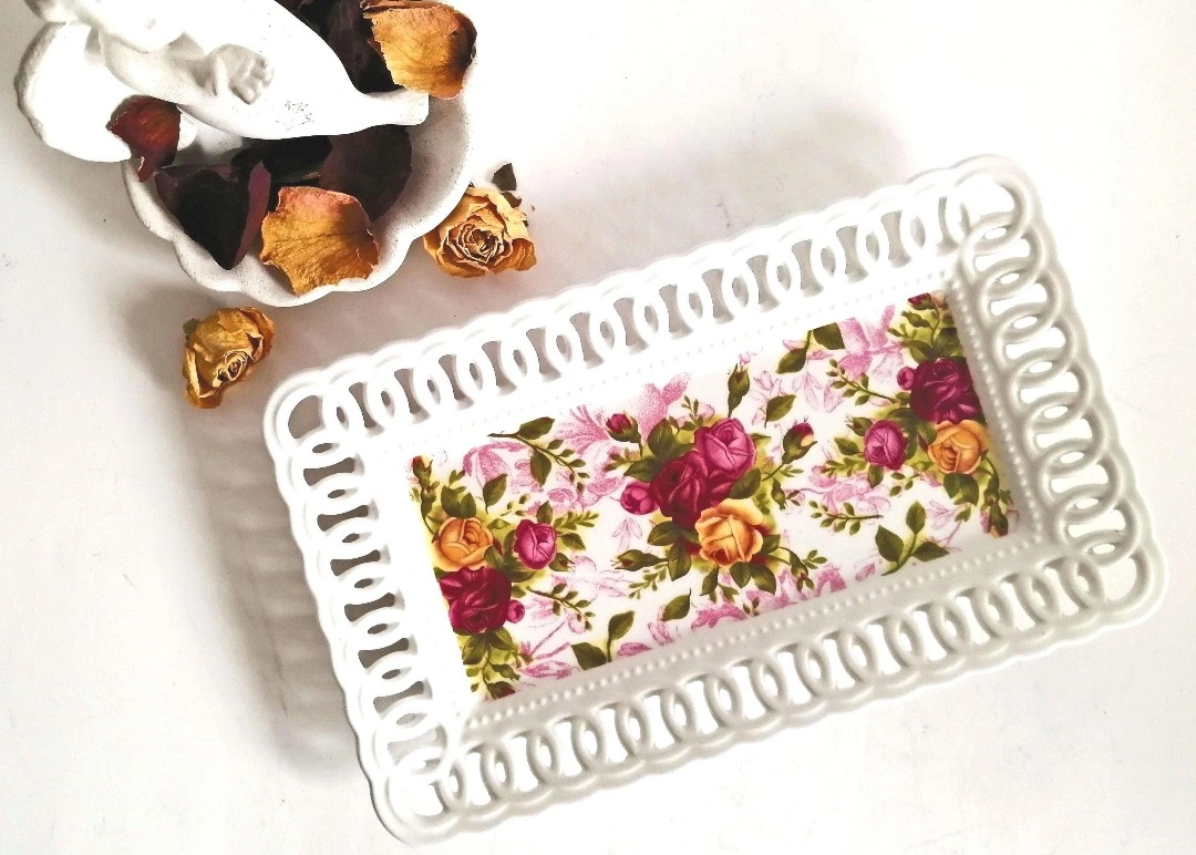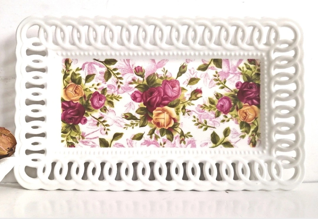 Gorgeous Royal Albert porcelain tray. Rectangle dish with porcelain lace border. Red and yellow rose motif center. Measures approximately 9 inches x 5.25 inches. Good vintage condition. Very giftable. Shabby chic appeal. π PICK UP TOWNLINE HWY 2 AREA π CASH is preferred please βΊοΈ