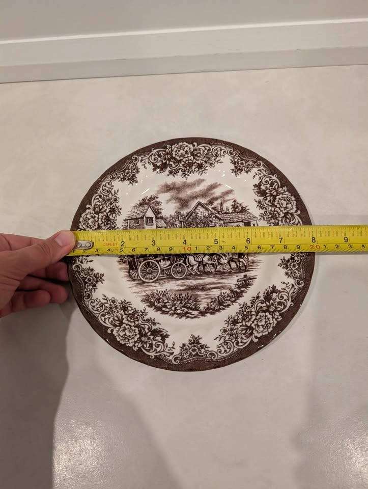 This beautiful plate features a traditional English brown and white Coaching Scene. Made in England Fine Earthenware Dishwasher and microwave safe