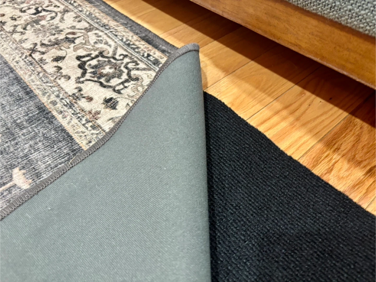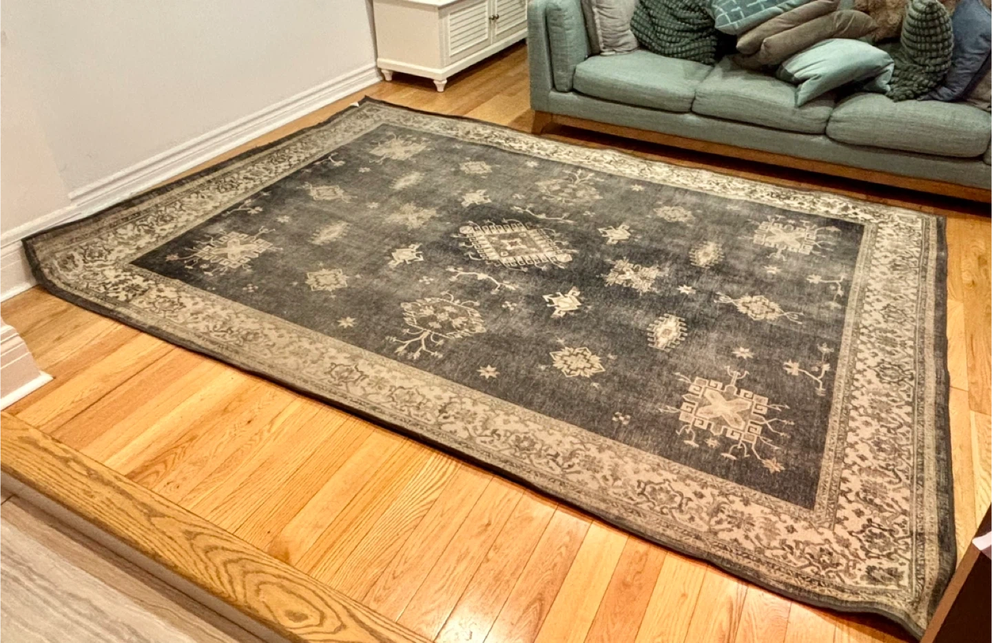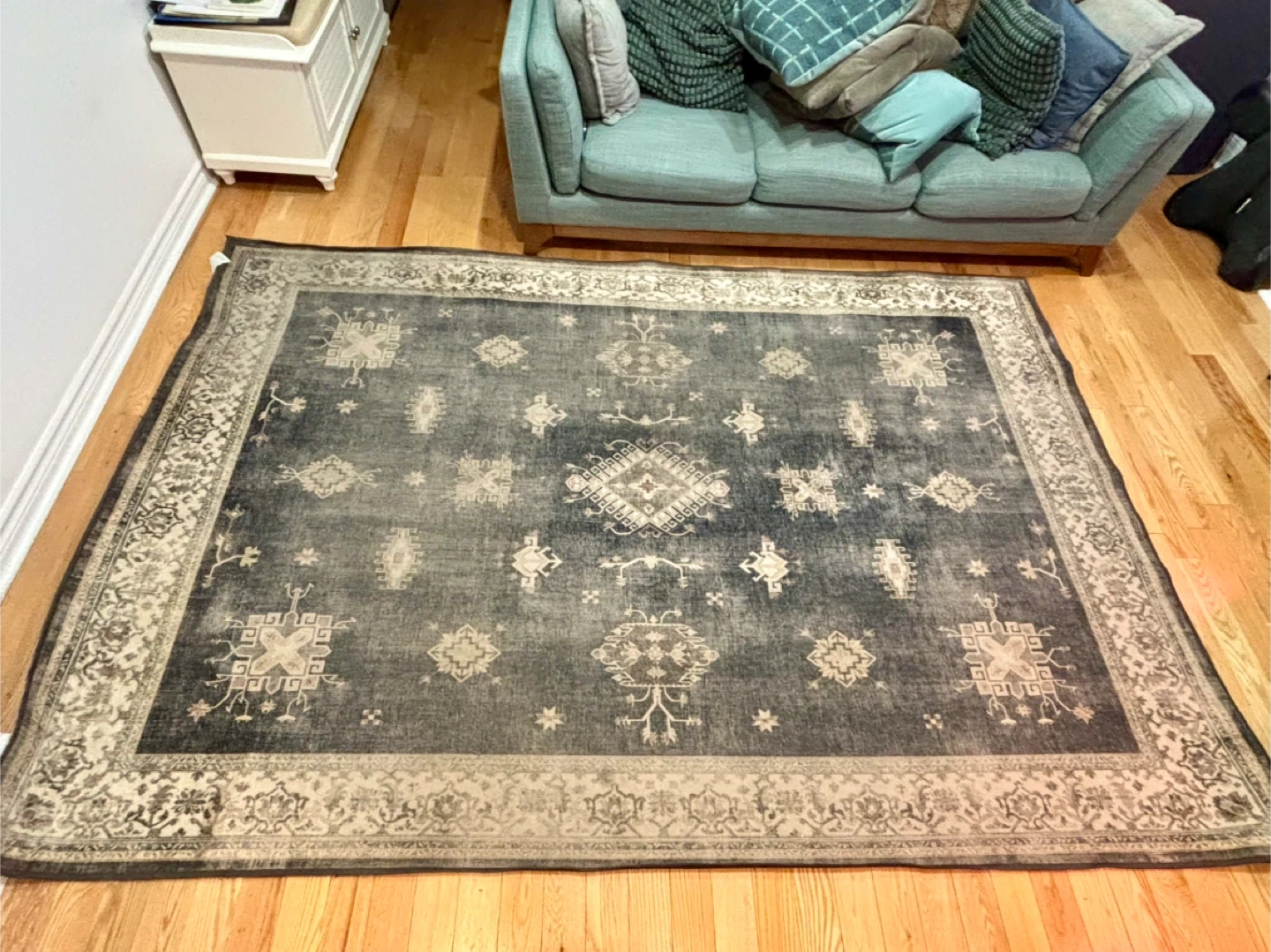 Ruggable Rug & Pad System - 6’ x 9’ Grey, Blue, Tan, persian distressed theme We bought this rug in 2021. Slight wear along edges of rug but otherwise in good condition. Bottom of pad requires a bit of a clean. Sold as is. Pick up only. https://ruggable.com/products/verena-dark-wood-rug