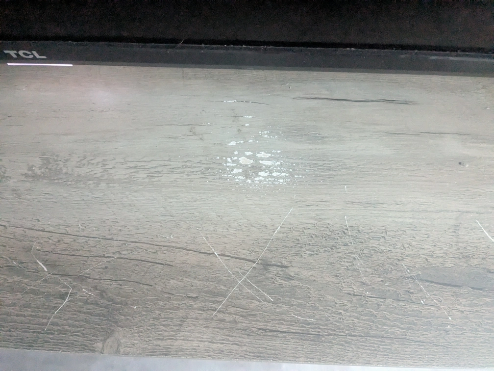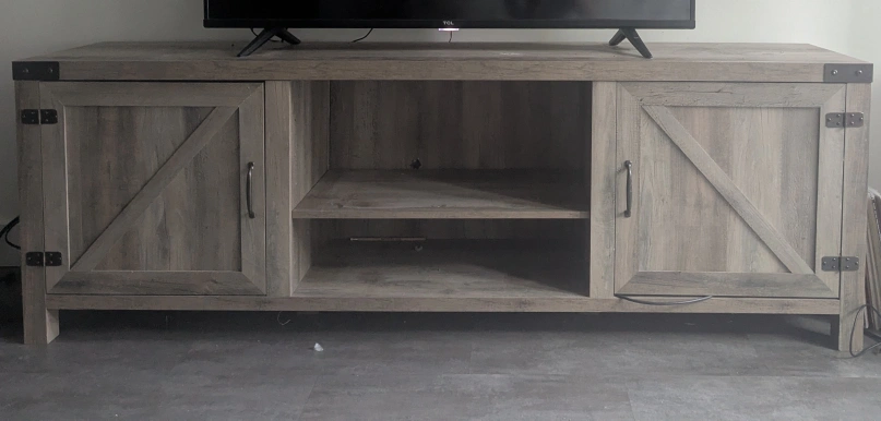 Selling a rustic grey TV stand with doors. It's perfect for adding a touch of farmhouse charm to your living room. There are some minor scratches on the top surface, as shown in the photos, but overall it's in good condition and very sturdy. Great for storing media consoles and other items!