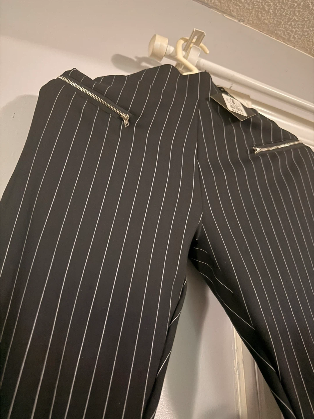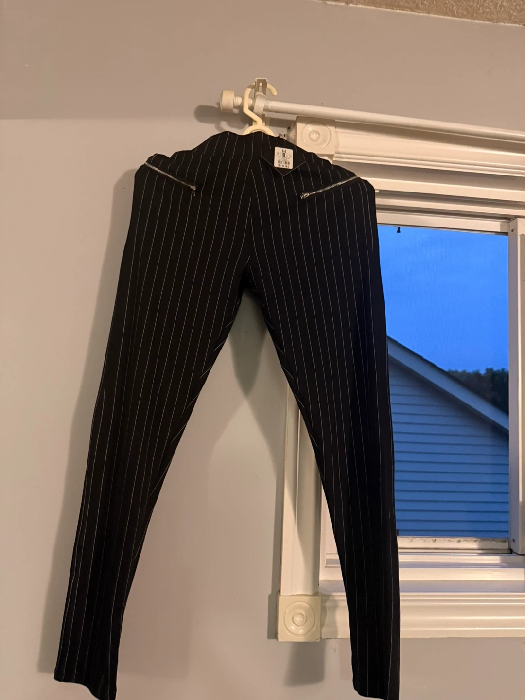 RW&CO pinstripe pants in size 4! These pants feature a sleek black colour with a subtle pinstripe design. They also have stylish zipper details near the pockets. Perfect for a professional or chic casual look!