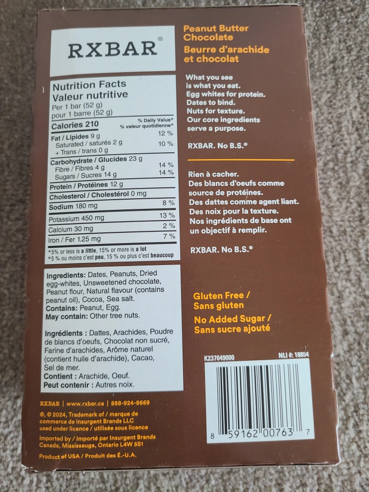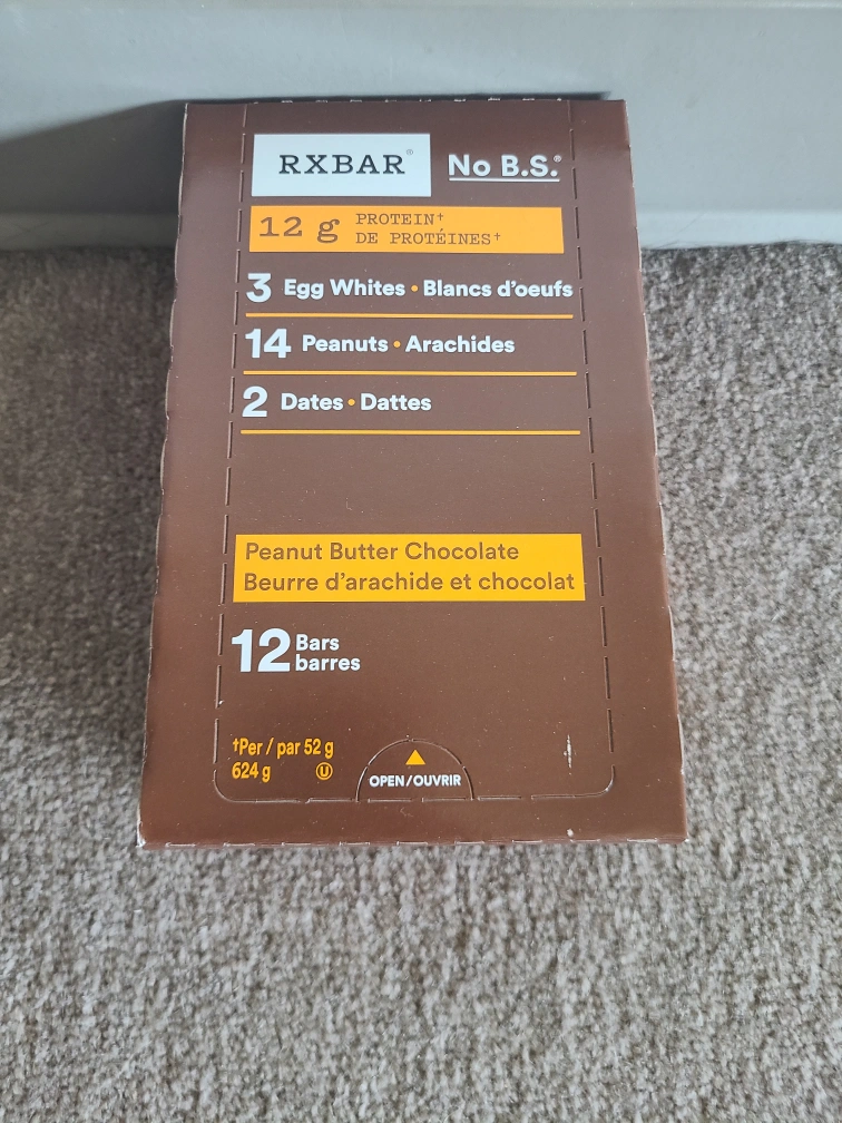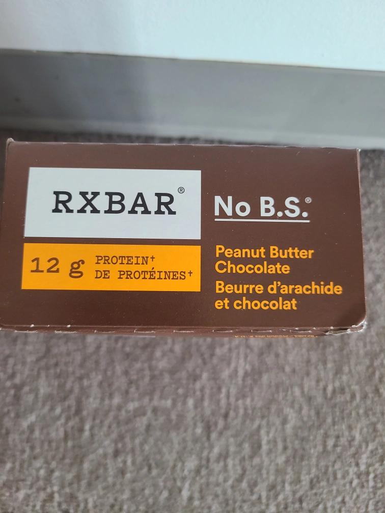 Selling a box of RXBAR protein bars, peanut butter chocolate flavour! Each bar has 12g of protein and contains dates, peanuts, and egg whites. Gluten-free and with no added sugar. Best before 2026 May 19 I have 4 boxes left.