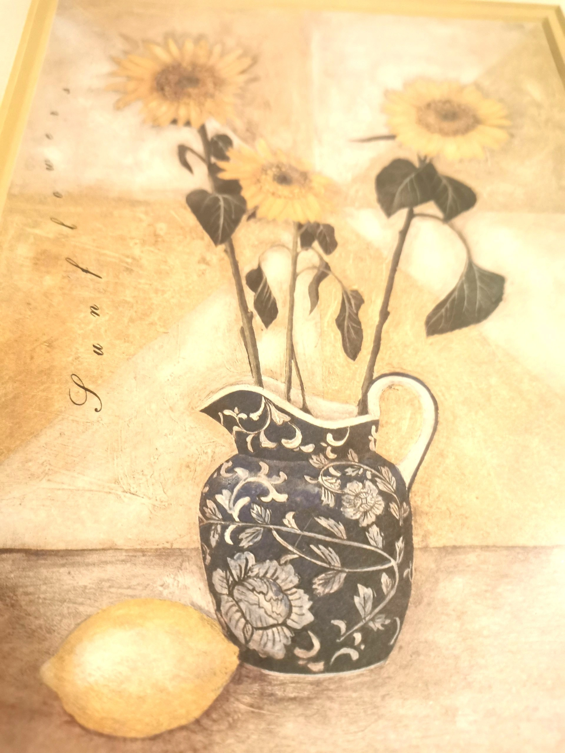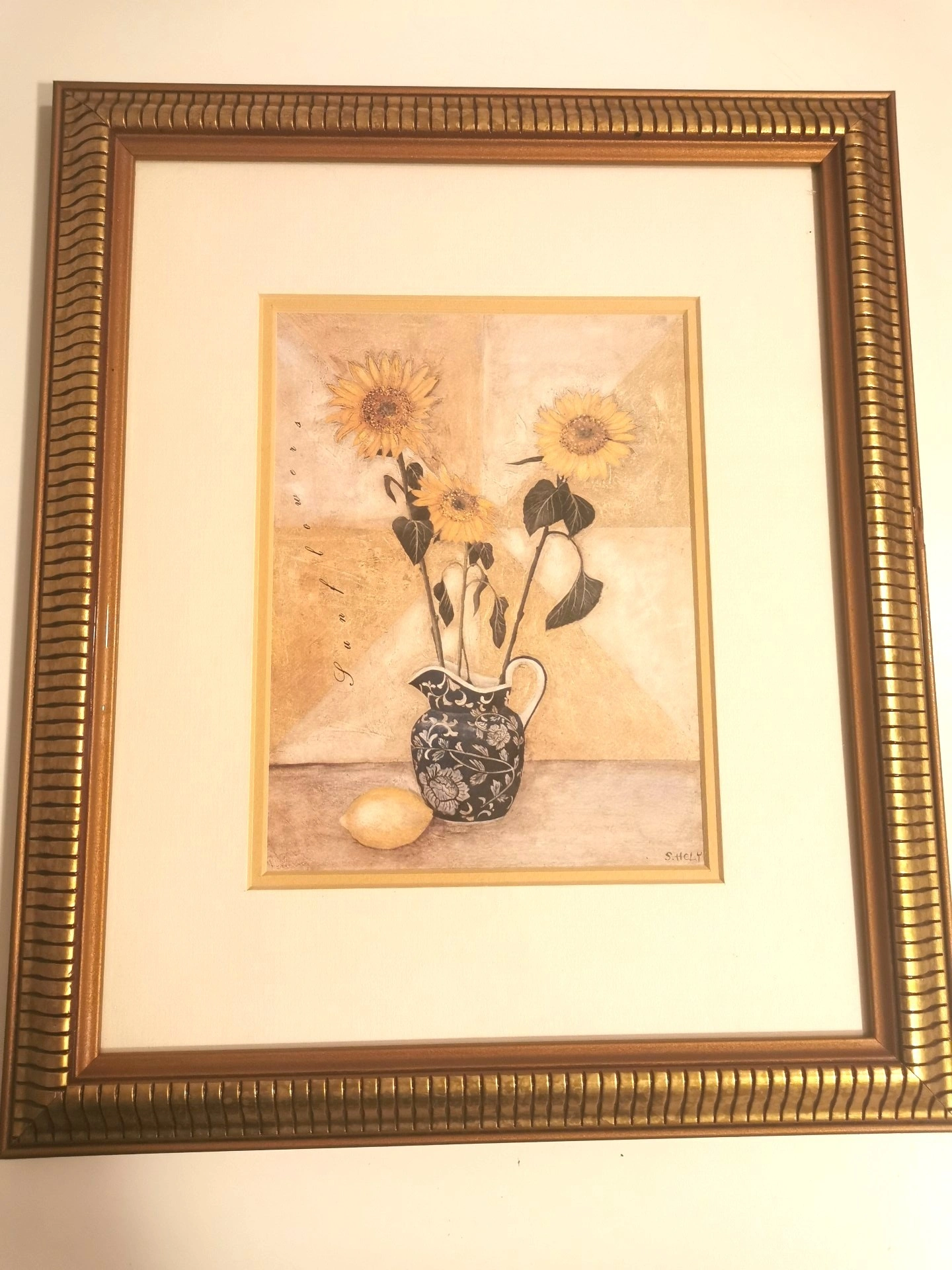 Artist / Signature: Marked “S. Hely” (please see photo of signature) Subject / Theme: Sunflowers in vase Dimensions: Overall framed size approx 15″ (width) × 13″ (height) × ~1.25″ depth Medium: lithograph Condition: Good vintage condition light wear commensurate with age please see photos as they are part of the description. Framing / Matting: Original frame Shipping / Packaging: Fragile, will be securely packaged