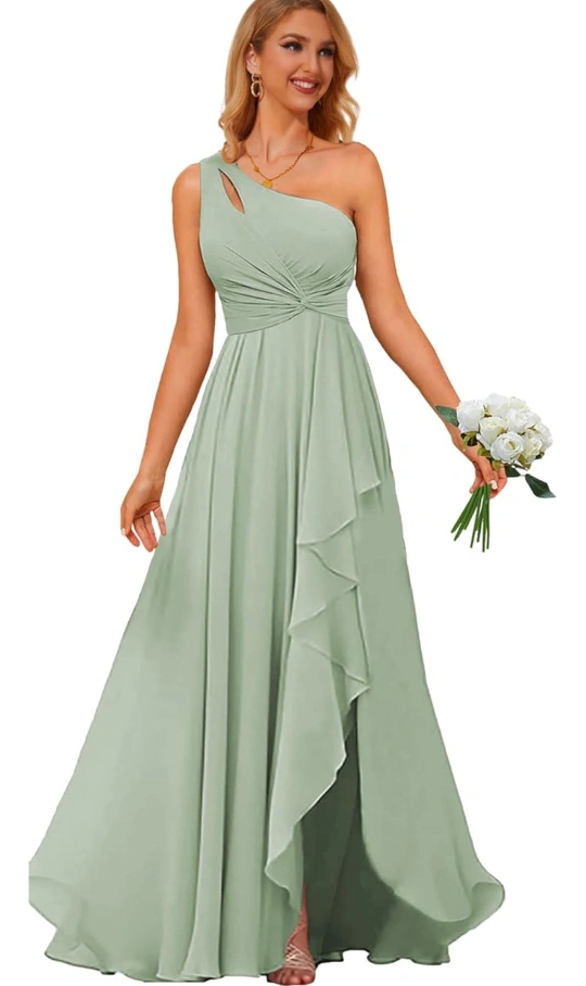Brand New. This is a beautiful sage green one-shoulder chiffon dress. It features a flattering silhouette with a unique one-shoulder design and a flowing skirt. Perfect for a bridesmaid or any special occasion! One Shoulder Bridesmaid Dresses with Slit Long Formal Dress for Women Corset Chiffon Evening Gown