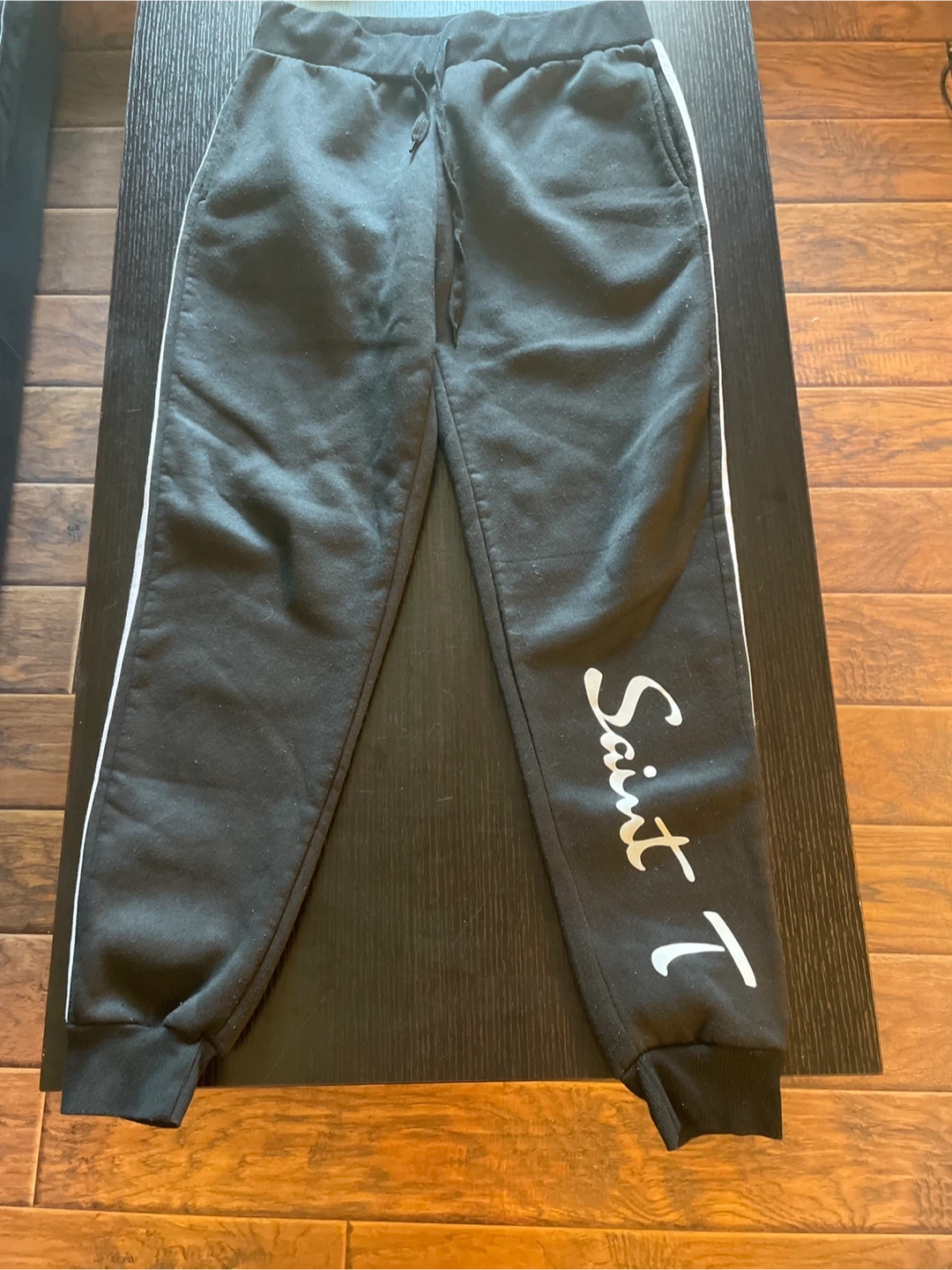 Selling a pair of black track pants with a white stripe down the side. The brand name 'Saint T' is written in white on the leg. They are in great condition!