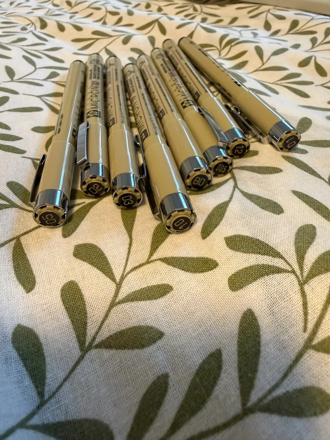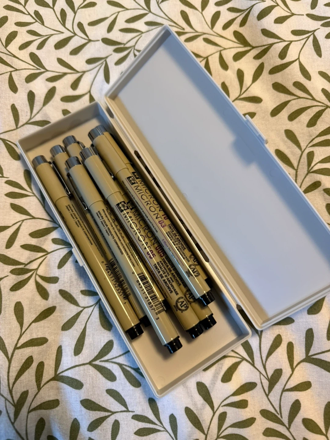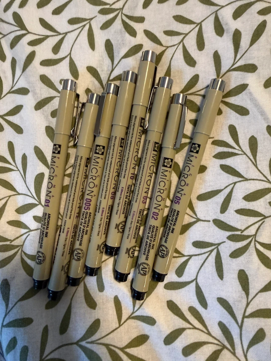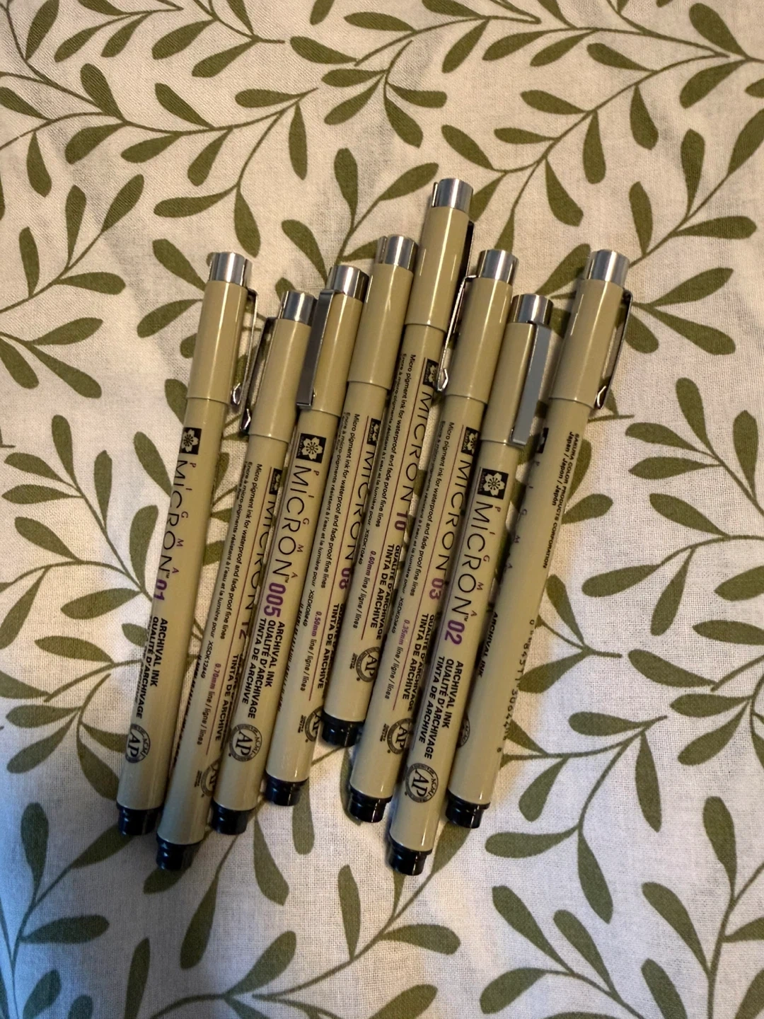 Selling a set of Sakura Pigma Micron pens! Includes various sizes from 01 to 10. Perfect for artists and anyone who enjoys detailed work! Really never used it.